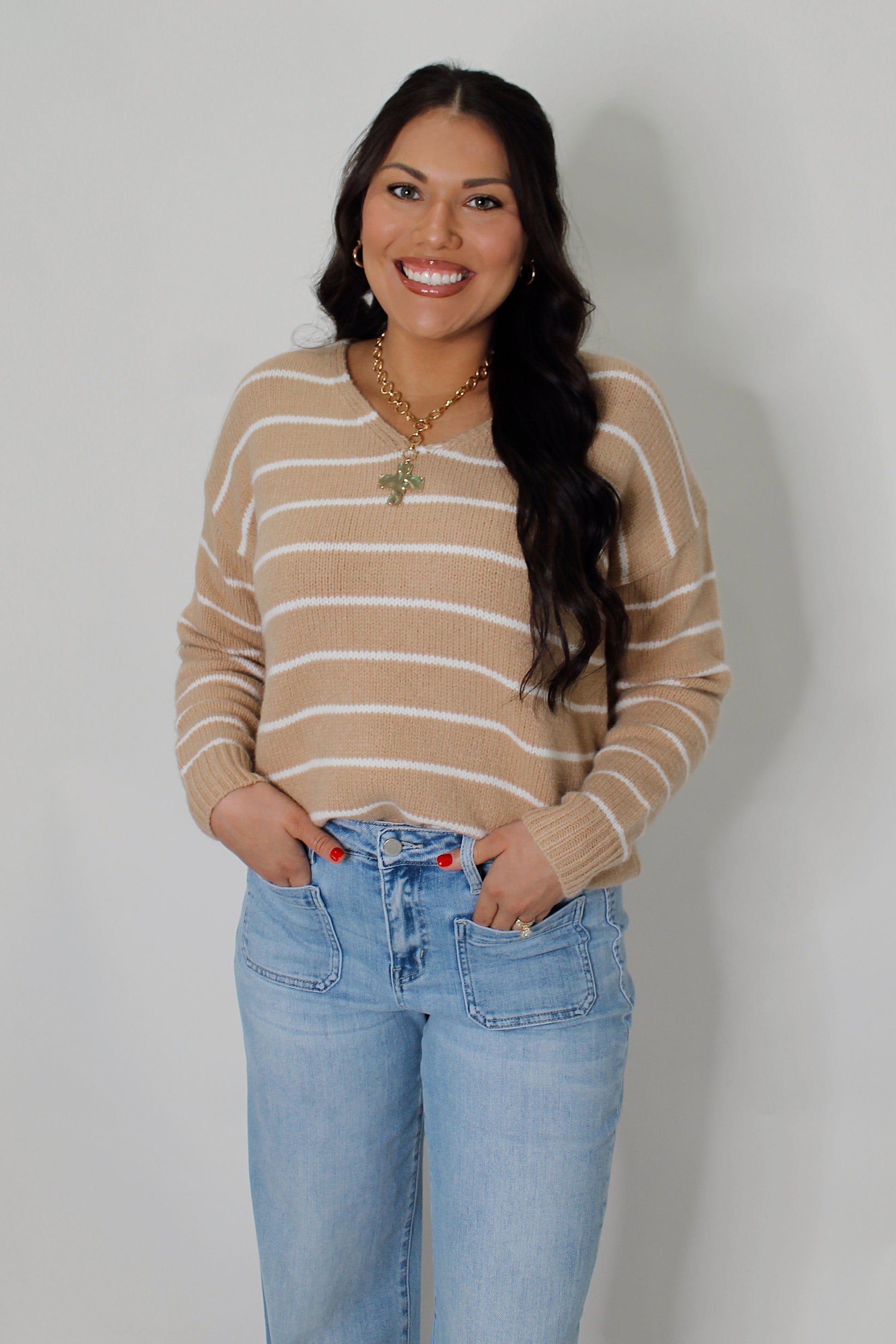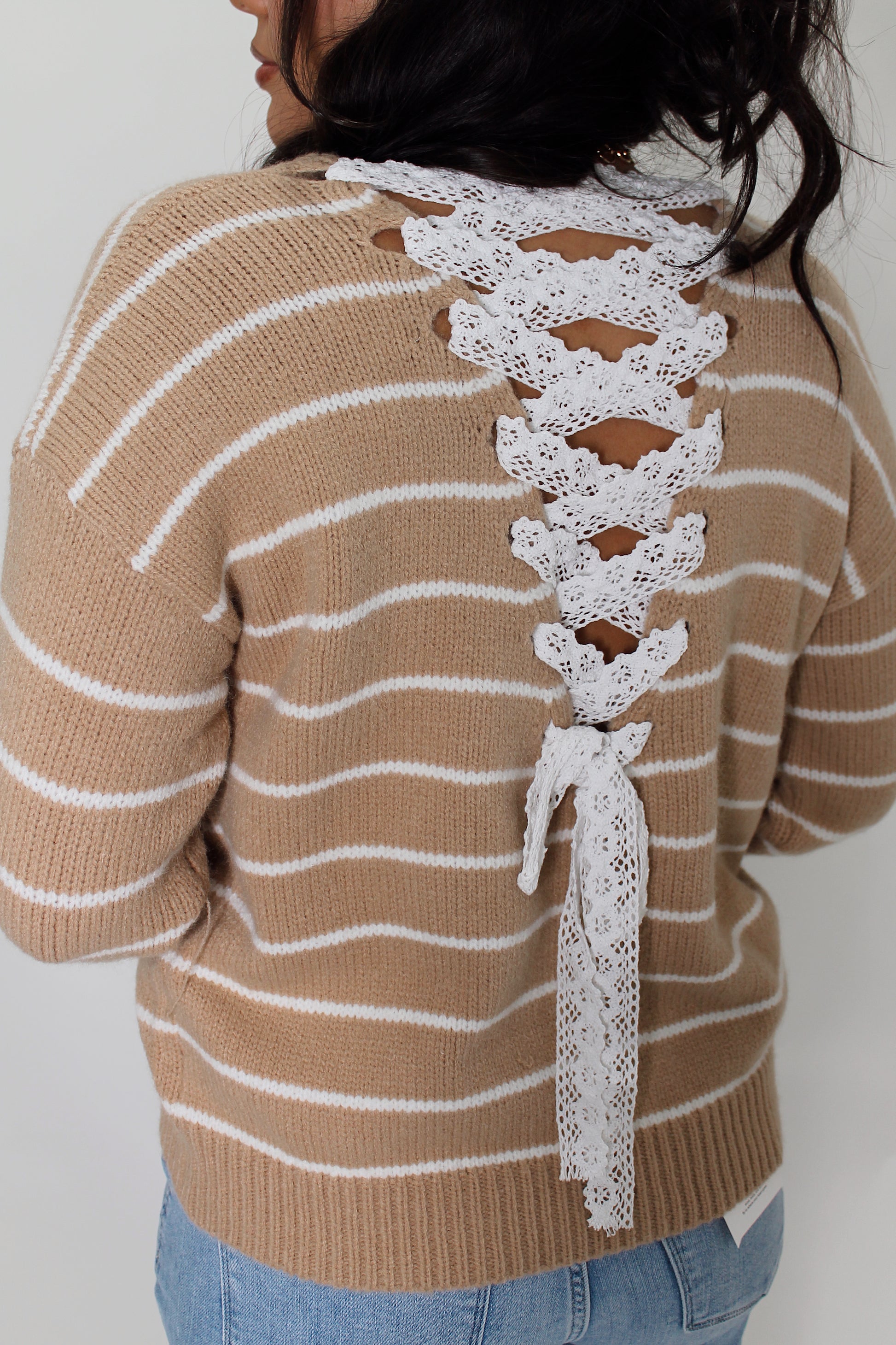 Get cozy and stay trendy in our Back Lace Up Knitted Sweater. With its unique latte and ivory color stripes and cute lace up detail in the back, this sweater is perfect for the girly and playful fashionistas. Stay warm and stylish all season long! (Only 1 exclamation point used)
