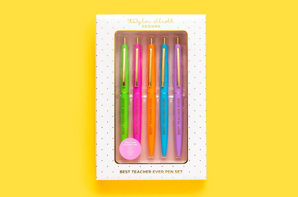 Make your teacher's day with this Best Teacher Ever Pen Set! These 5 colorful pens are the perfect gift for a beloved educator, adding a fun touch to their daily grading and note-taking. Show your appreciation in a unique and playful way with this quirky set.