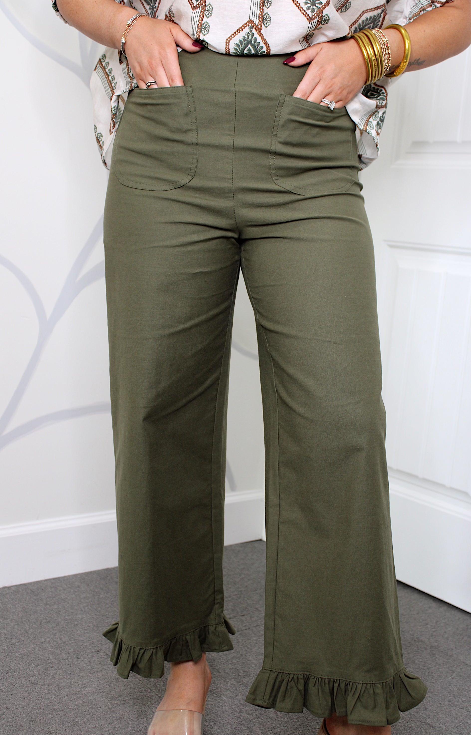Step into style with the Better Days Ruffle Pant in a rich olive green hue. These dress pants feature a playful ruffle hem that adds a flirty touch to your look, perfect for brightening up any occasion. Crafted to blend comfort and charm, they’re your go-to for effortless chic from day to night.