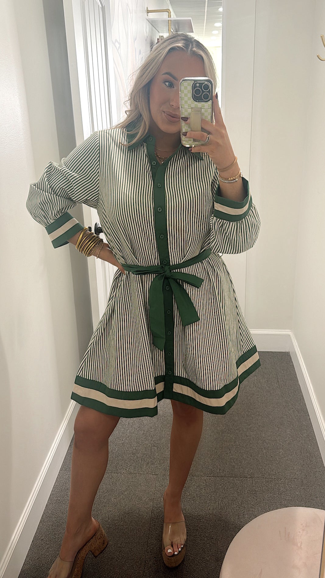 Step out in style with the Classic Charm Mini Dress, featuring playful hunter green and off-white stripes. This mini dress combines timeless stripes with a fun, flirty cut that’s perfect for any occasion. Its classic design keeps your look effortlessly chic while adding a touch of spirited charm to your wardrobe.
