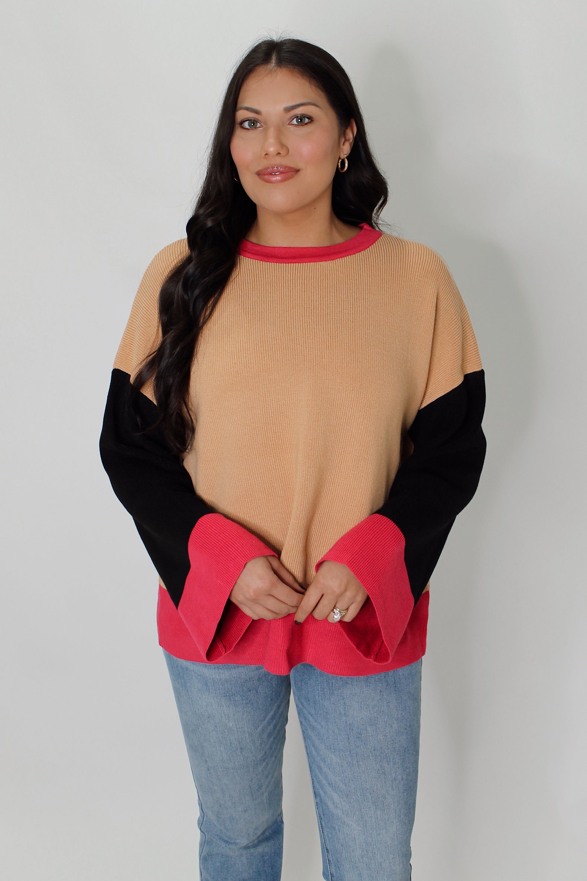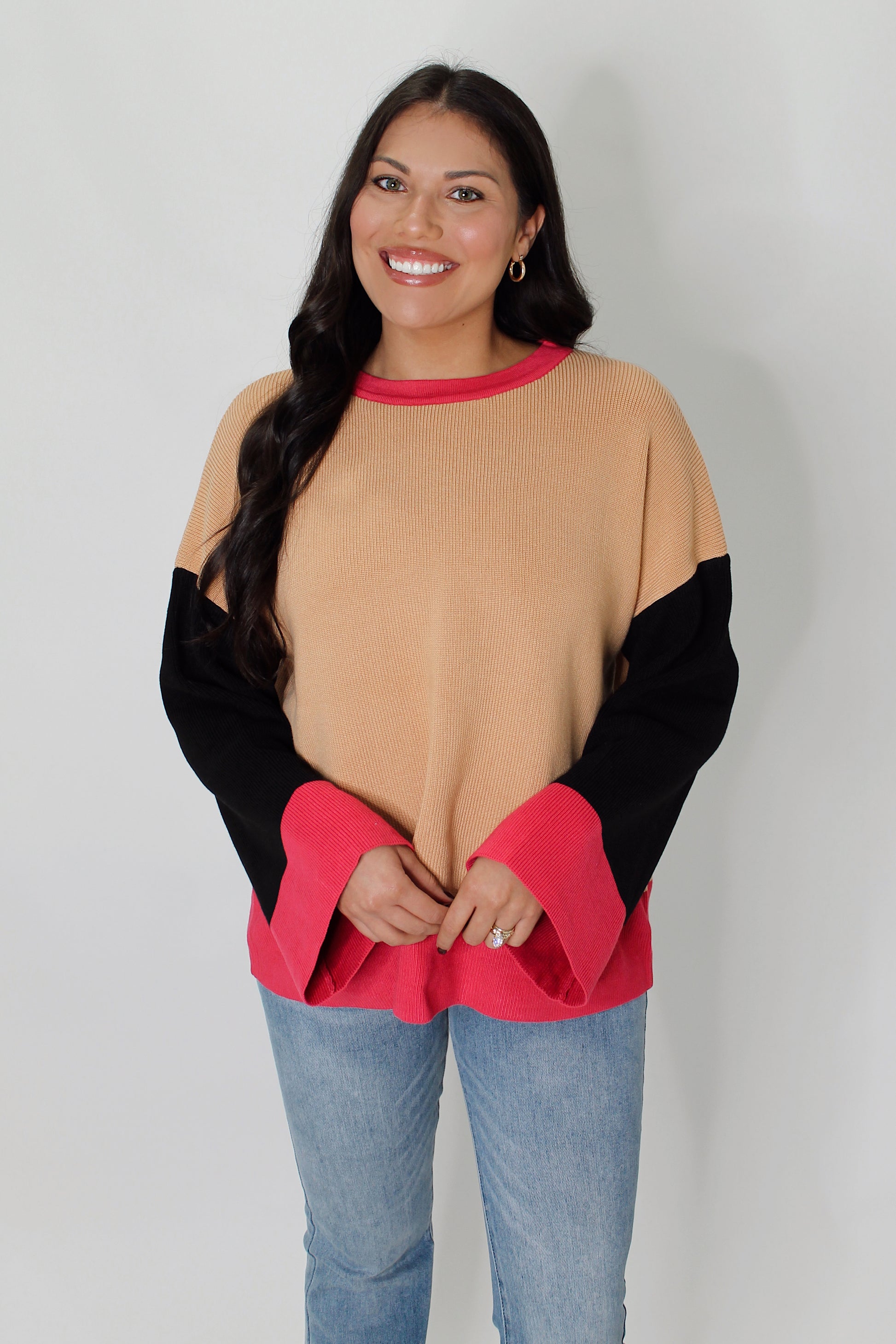 Stay stylish and cozy with our Going Out For Coffee Sweater! This playful knit features on-trend bell sleeves and a unique colorblock design in apricot, fuchsia, and black. Soft, comfy, and oh-so-cute, this sweater is perfect for any coffee run or outing. Why sacrifice comfort for style when you can have both?!