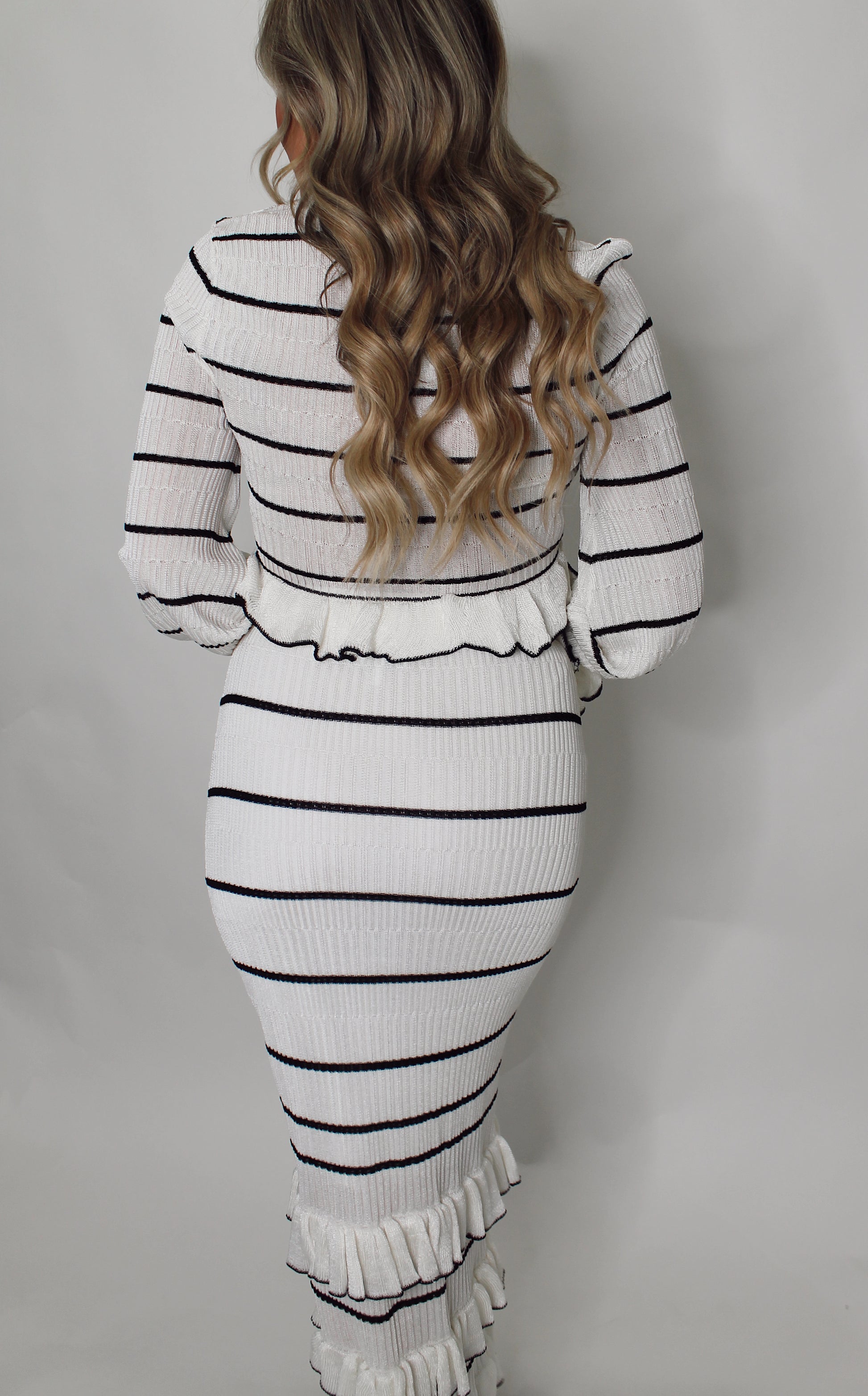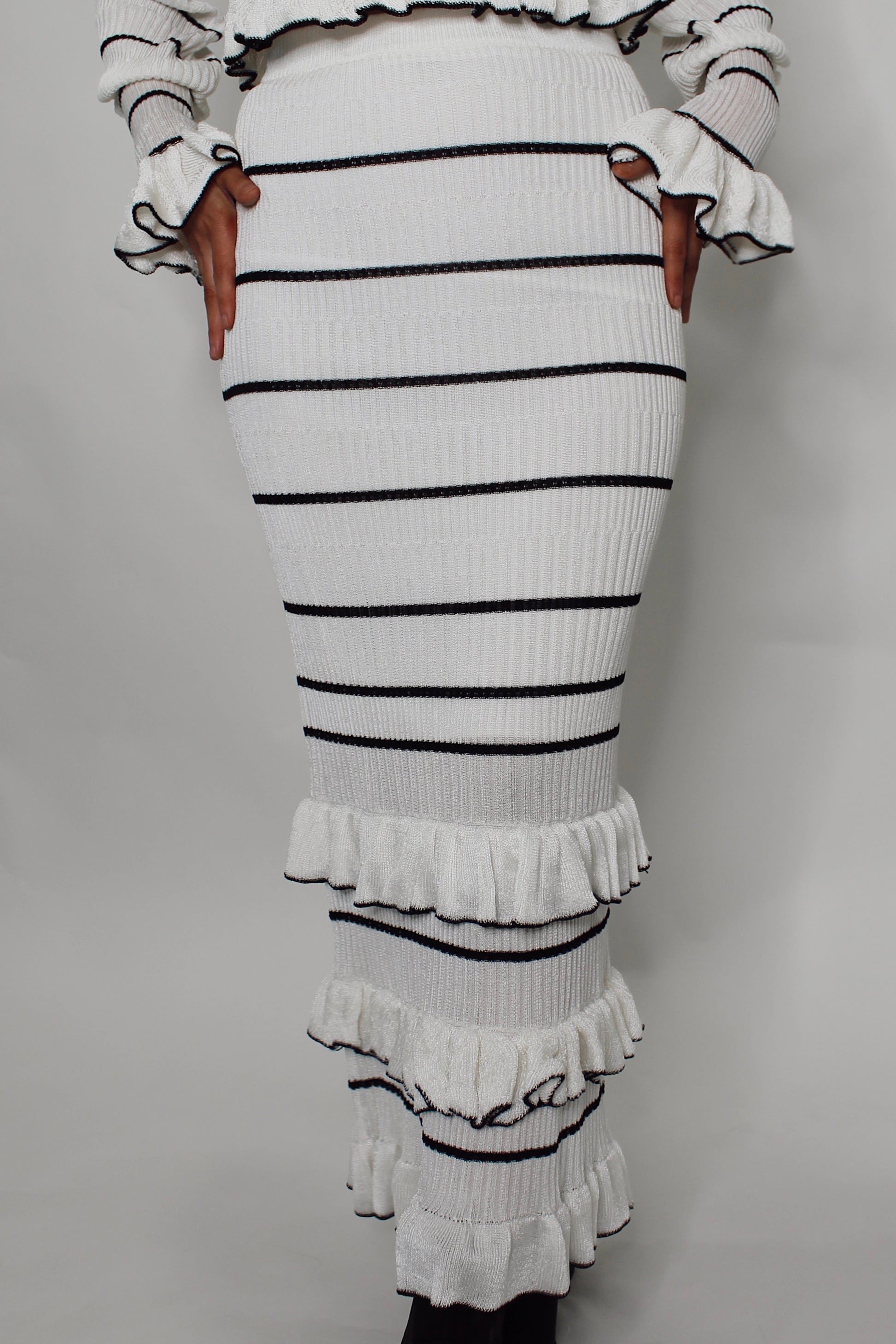 Unleash your inner girly girl and be the chicest on your Italy getaway with this black and white matching set. The fitted and stretchy design accentuates your figure, while the ruffle hem detail adds a playful touch to the midi skirt and cropped top combination. Bellissimo!
