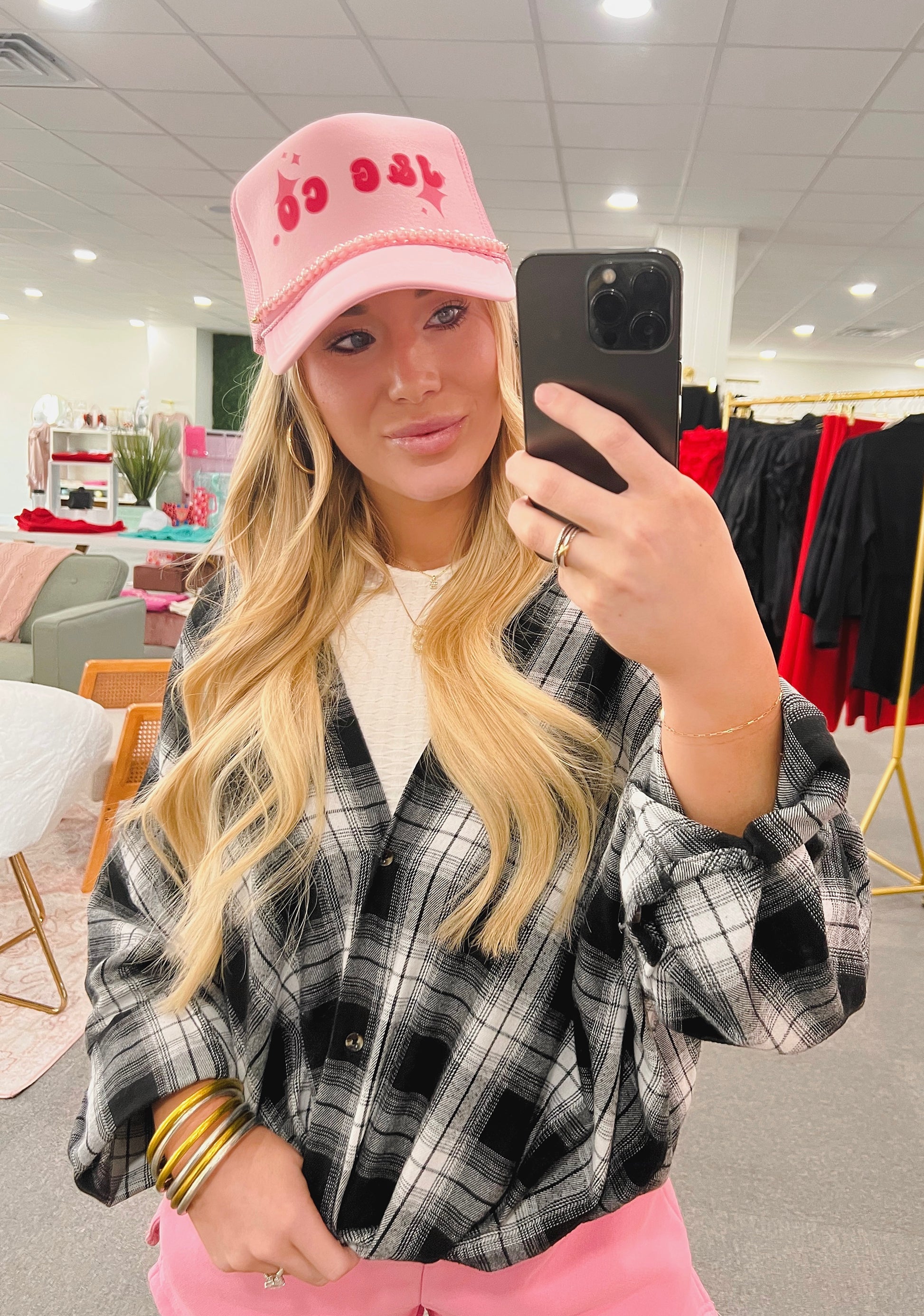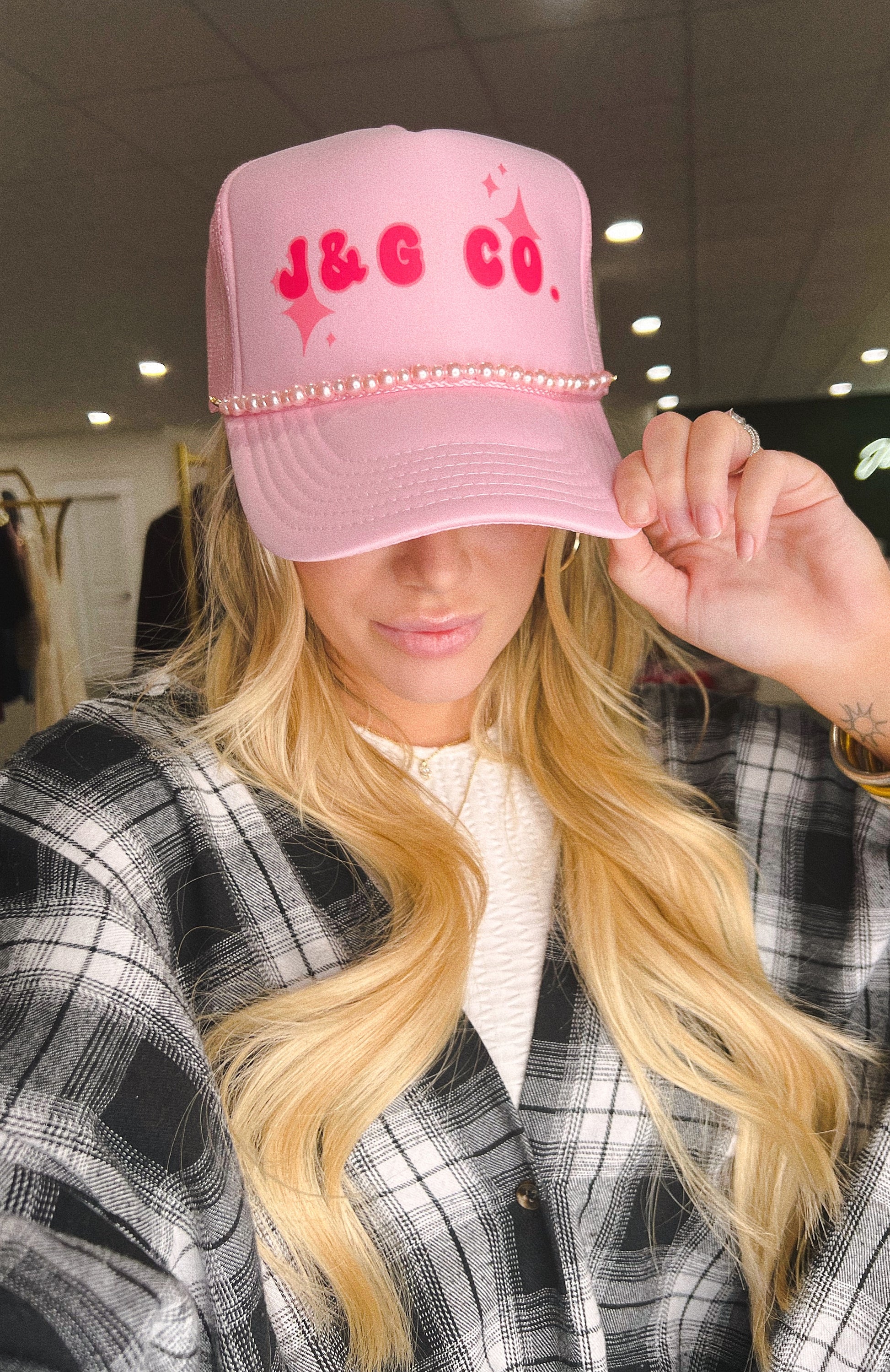 Add a pop of fun and support your local community with the J&G Trucker Hat. With its playful pink pearl detachable chain, this hat will make you stand out while representing all things pink. Don't miss out on sporting this must-have accessory.
