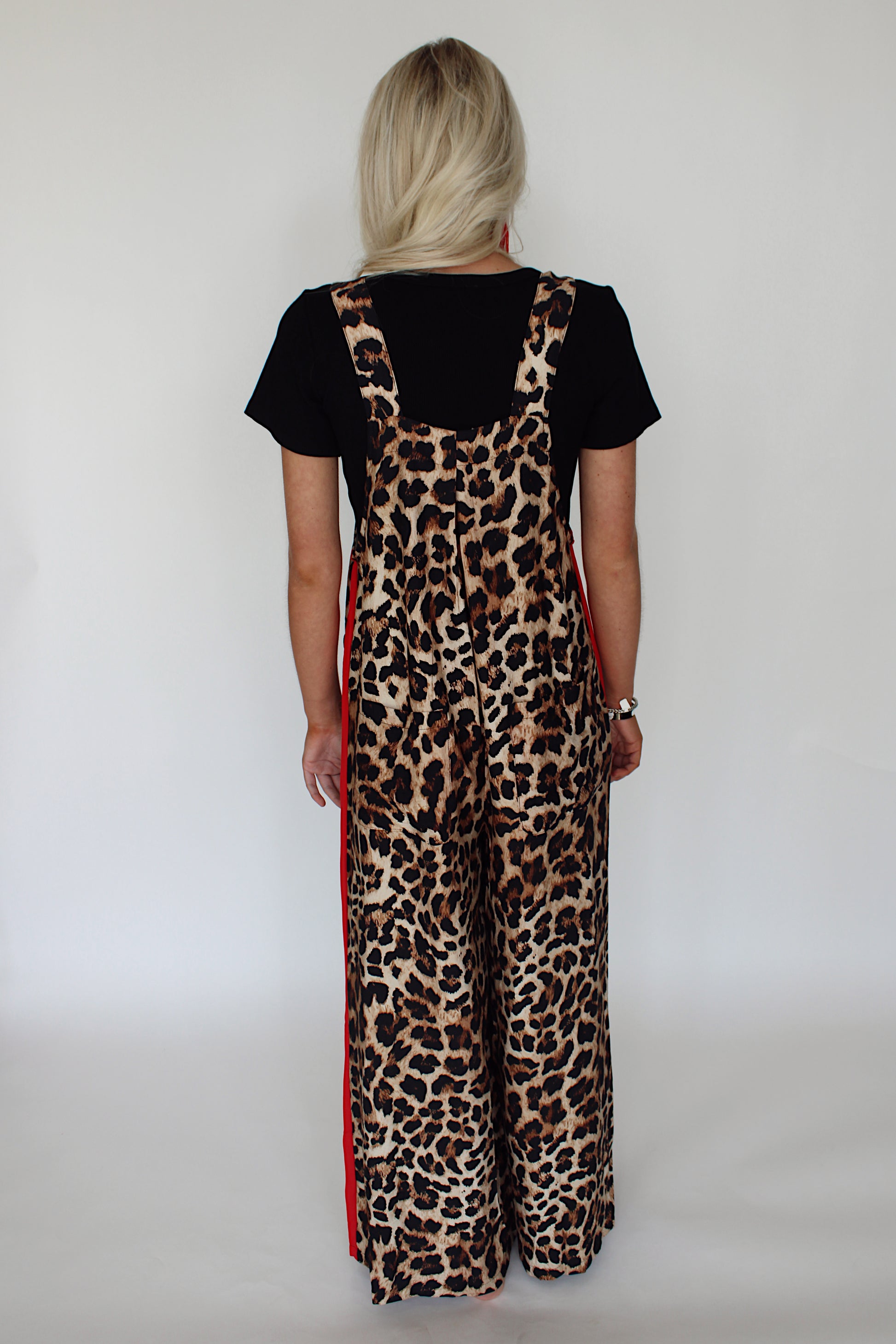 Show your team spirit in style with this playful Leopard Jumpsuit featuring a bold red stripe down the side. Perfect for celebrating the Pirates, the Raiders from our small towns, and the Georgia Bulldogs, it combines fun animal print with sporty flair. Comfortable and eye-catching, this jumpsuit makes game day or casual outings irresistibly cute and spirited.