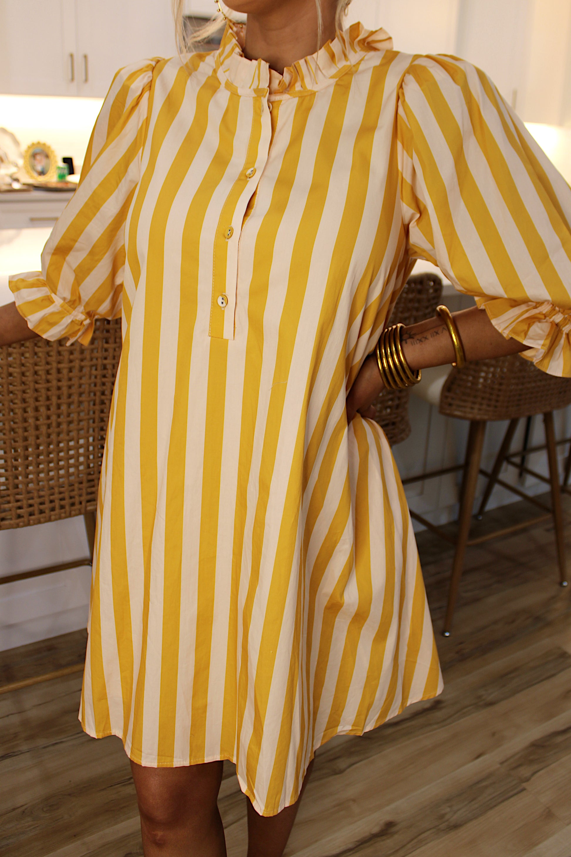 Slip into effortless style with this striped mini dress that plays by your rules. Featuring bold yellow and cream stripes with an adjustable tie waist, you can cinch it for a fitted silhouette or let it flow loose for a relaxed vibe. Perfect for those days when you want to look put-together without trying too hard—dress it up with heels or keep it casual with sneakers. Chic, versatile, and undeniably trendy.