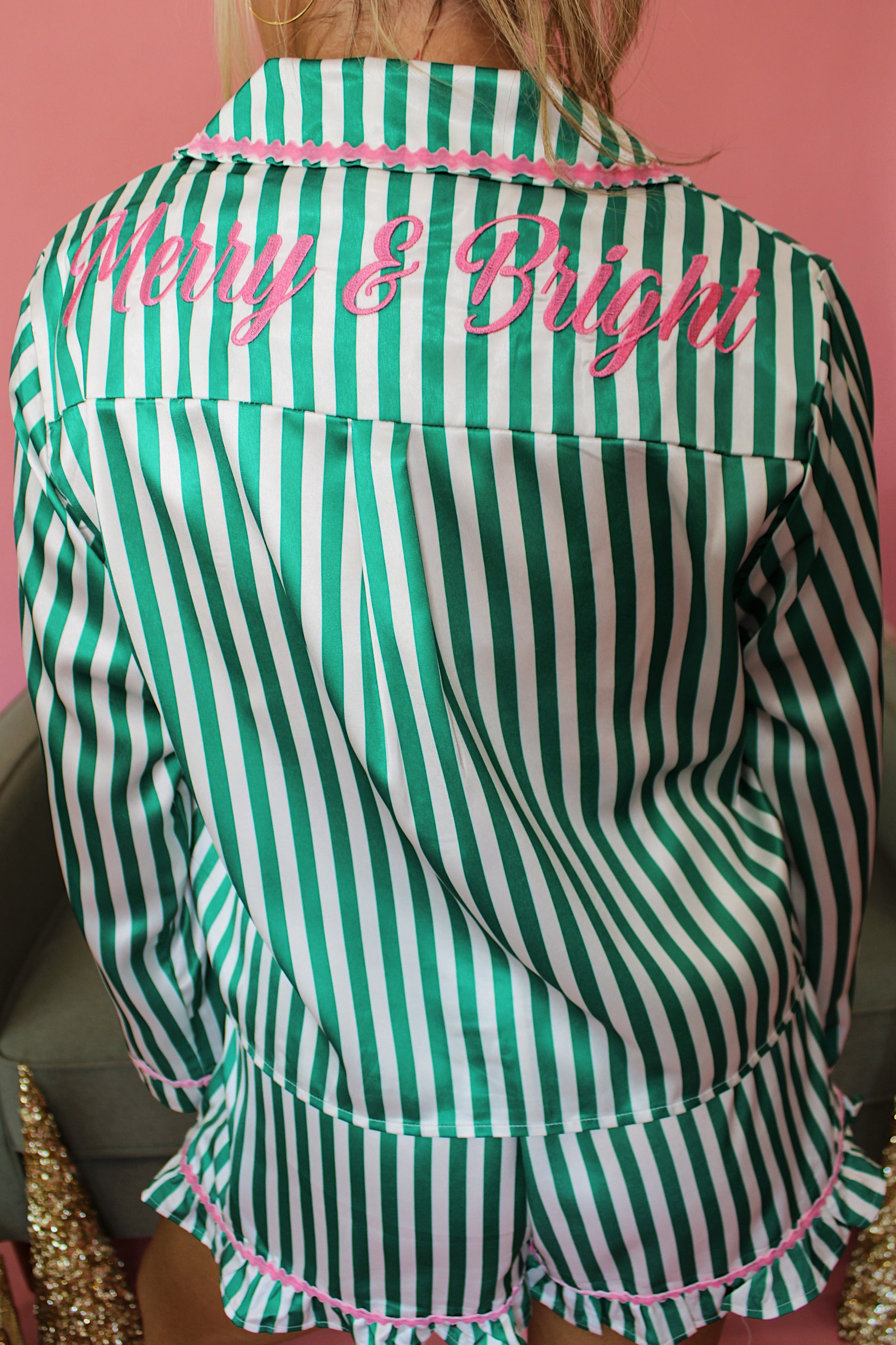 Slip into holiday comfort with these Merry & Bright Pajamas, where sage green meets soft pink for a festive color combo that's anything but basic. Luxe satin fabric keeps things silky smooth against your skin, while velvet details add a touch of cozy glamour. Perfect for lazy mornings, holiday parties, or those nights when you want to feel fancy while staying comfy. Because the best part of the holidays? Wearing pajamas all day long.