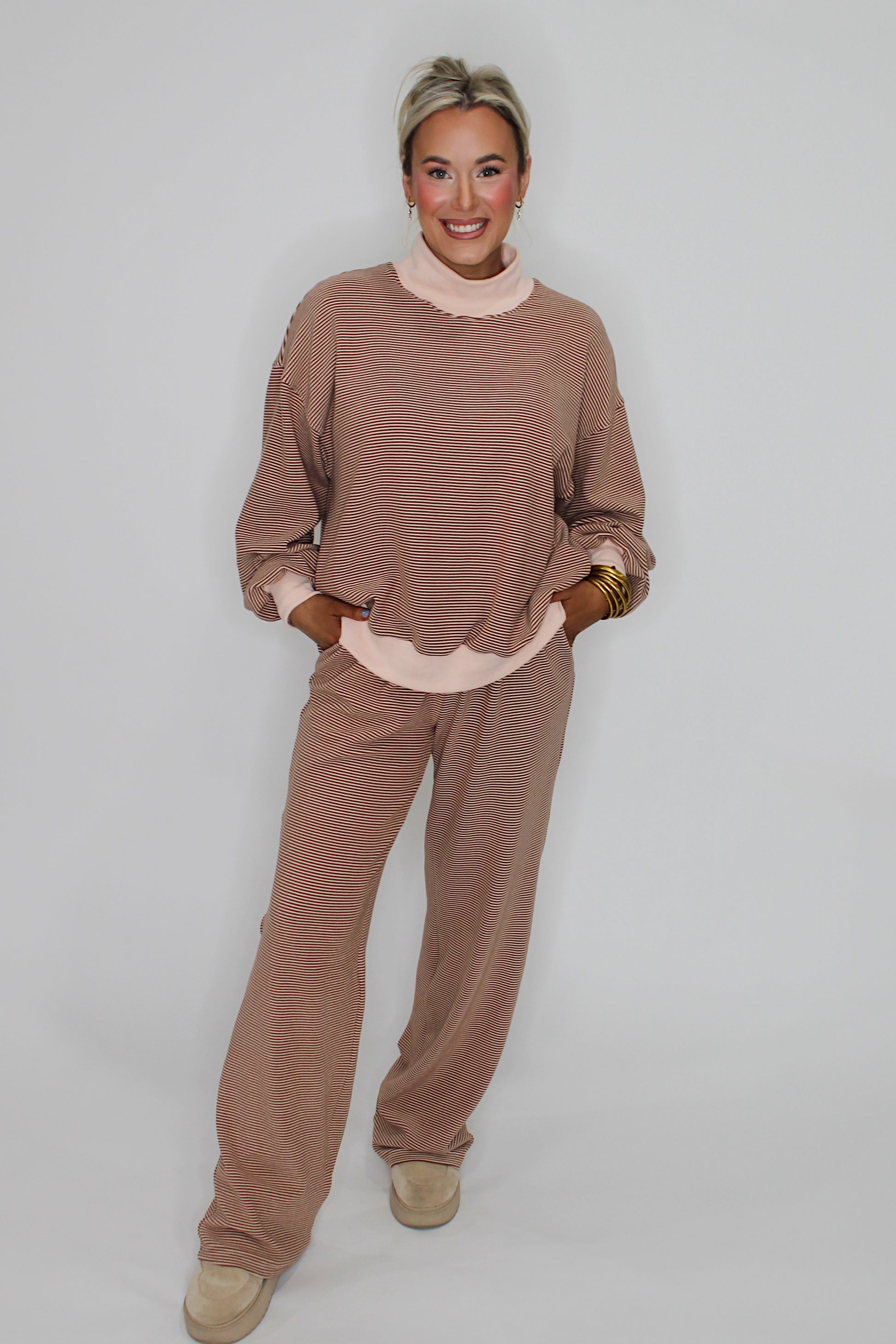 Sink into pure comfort with this Mock Neck Stripe Lounge set—the softest thing you'll ever own. The cozy pink and tan mock neck pairs perfectly with full-length straight leg pants designed with tall girls in mind. Tie waist detail adds a touch of adjustability and style. Whether you're lounging at home or running errands, this set wraps you in cloud-like softness that feels like a warm hug all day long.