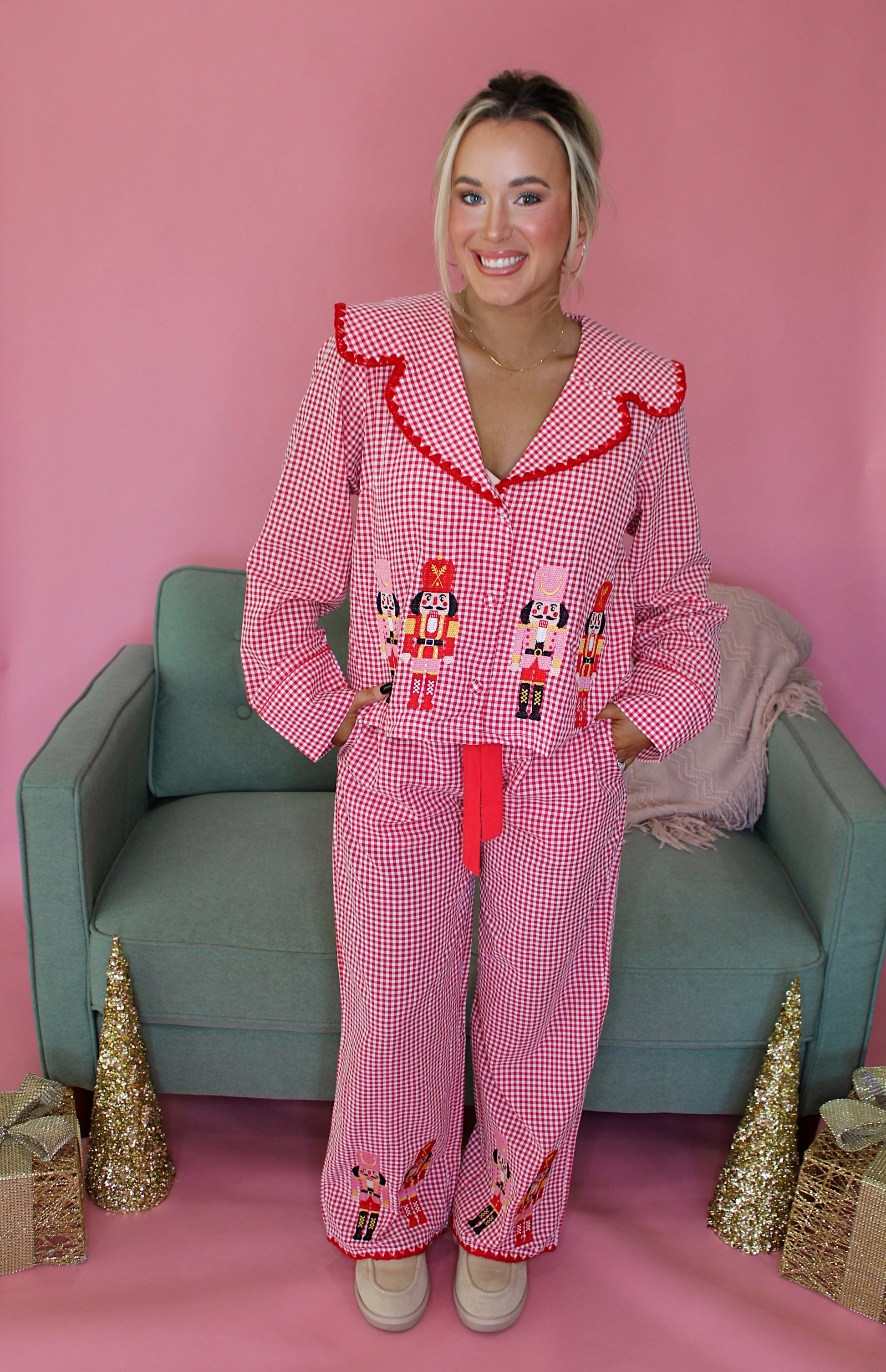 Nutcracker Embroidered Pajamas Bring festive charm to bedtime with these adorable nutcracker-embroidered pajamas. Featuring intricate embroidery details that capture the magic of the holiday season, these cozy sets blend comfort with whimsical style. Perfect for lounging, holiday parties, or gifting to nutcracker enthusiasts, they're a playful way to celebrate in style. Soft, comfortable, and undeniably cute—your new favorite pajamas await.