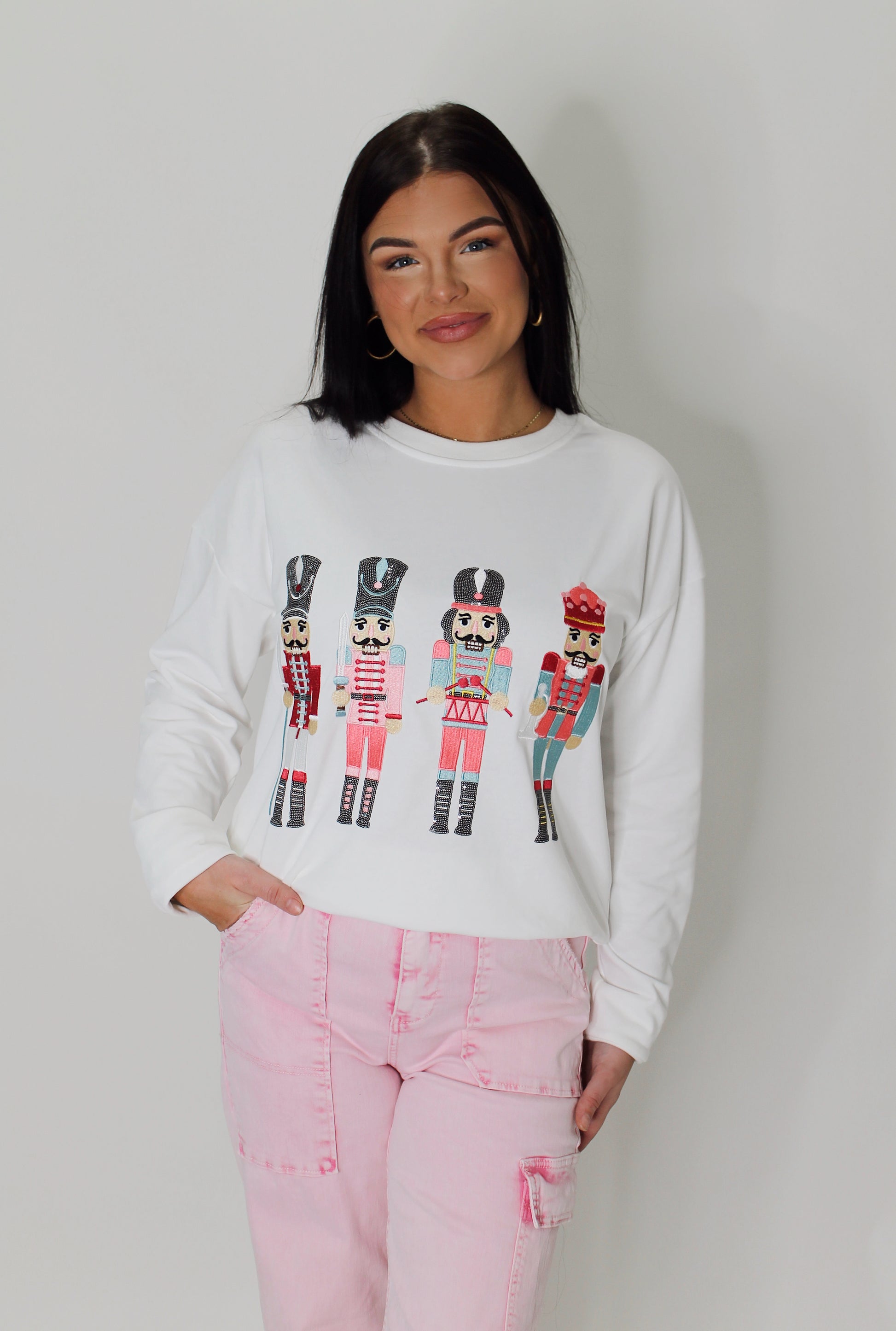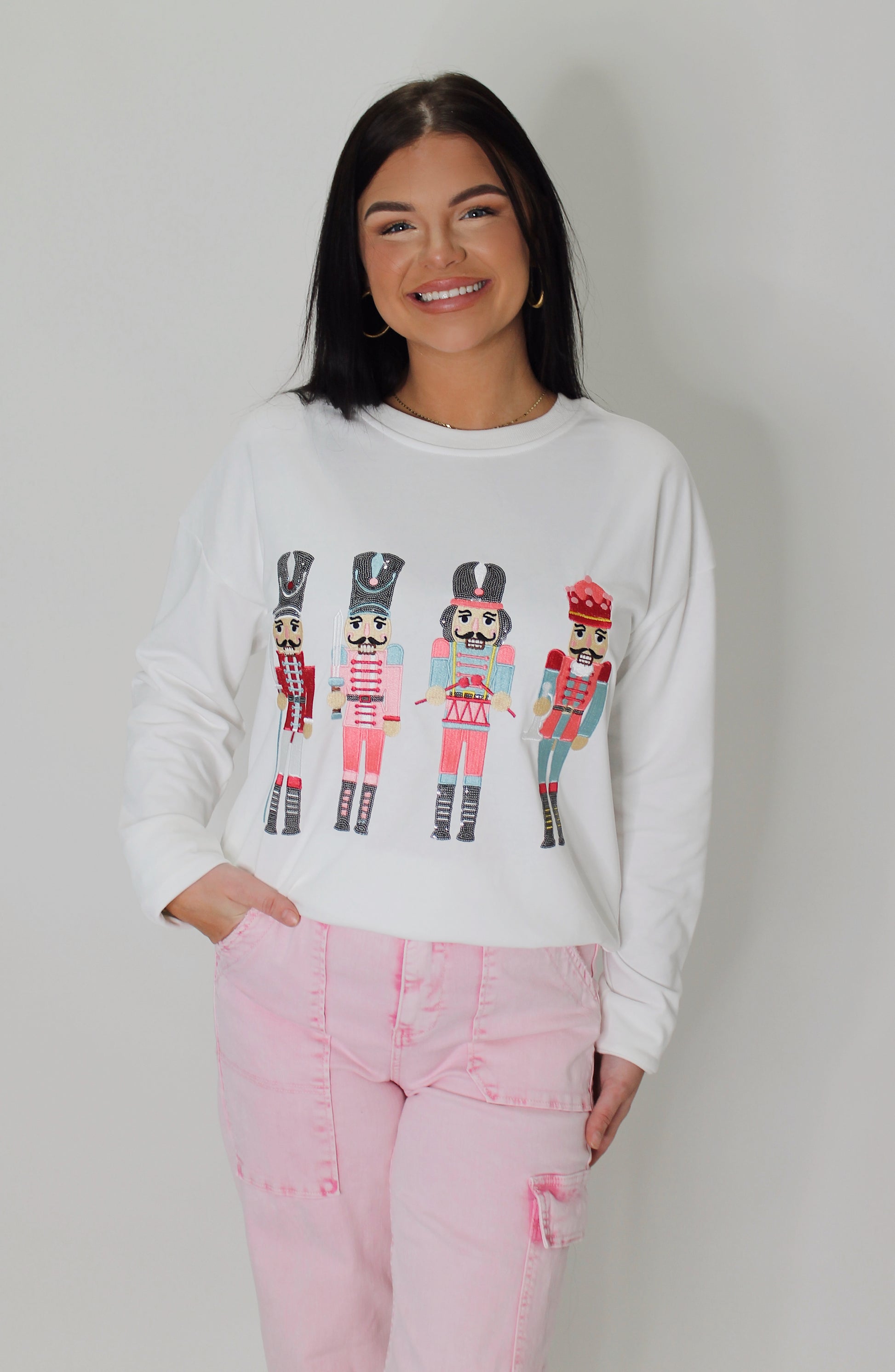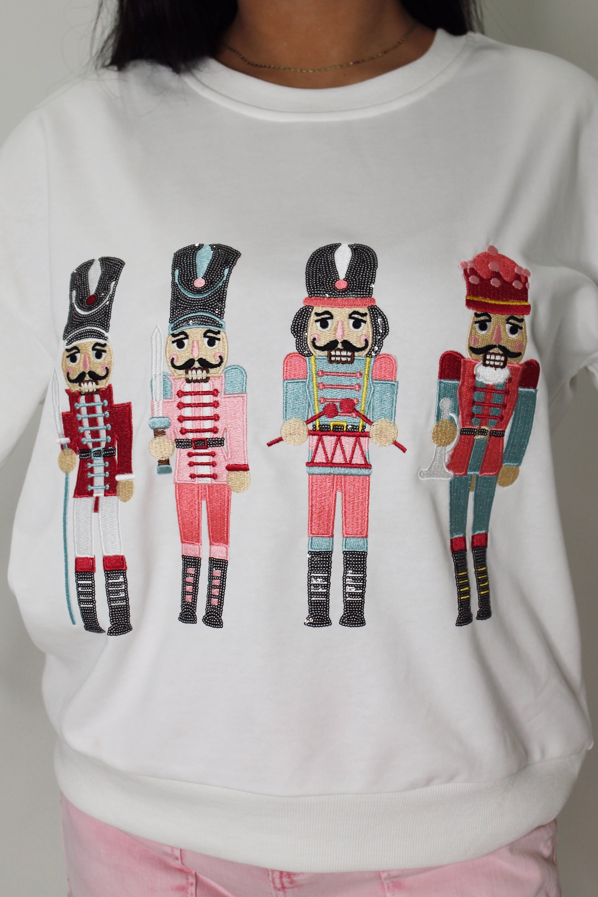 Get ready to crack up with this Nutcracker Pullover! The playful pink nutcrackers, sparkling with diamonds, will add holiday cheer to any outfit. Stay cozy in the white pullover while spreading Christmas spirit.