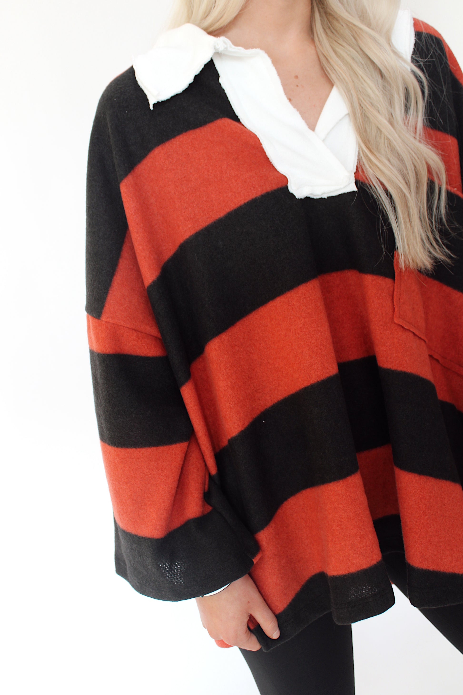 Wrap yourself in cozy comfort with this oversized pullover featuring bold red, black, and white stripes. Perfect for lounging or casual outings, its soft fabric feels like a warm hug, while the roomy fit adds a relaxed, playful vibe to your look. Stay snug and stylish all day long!
