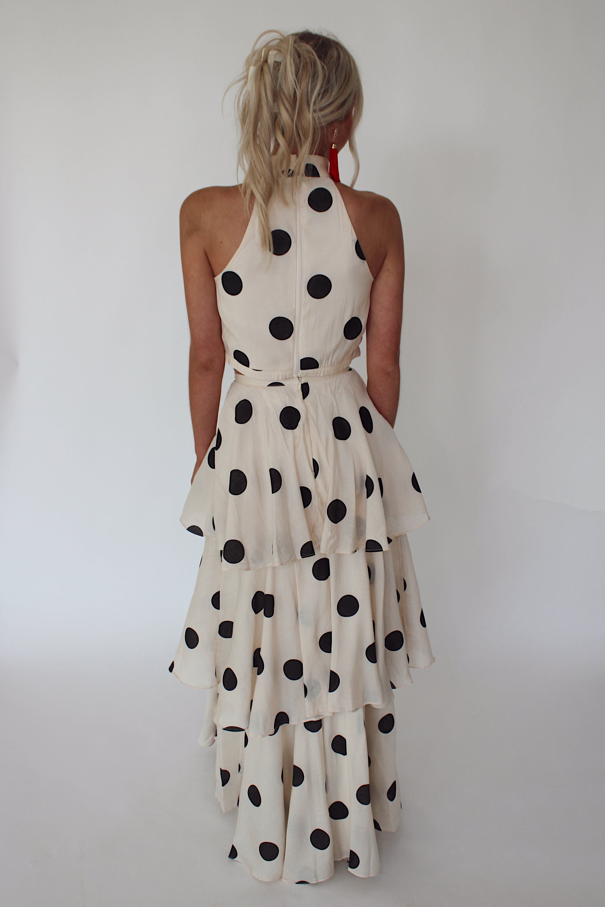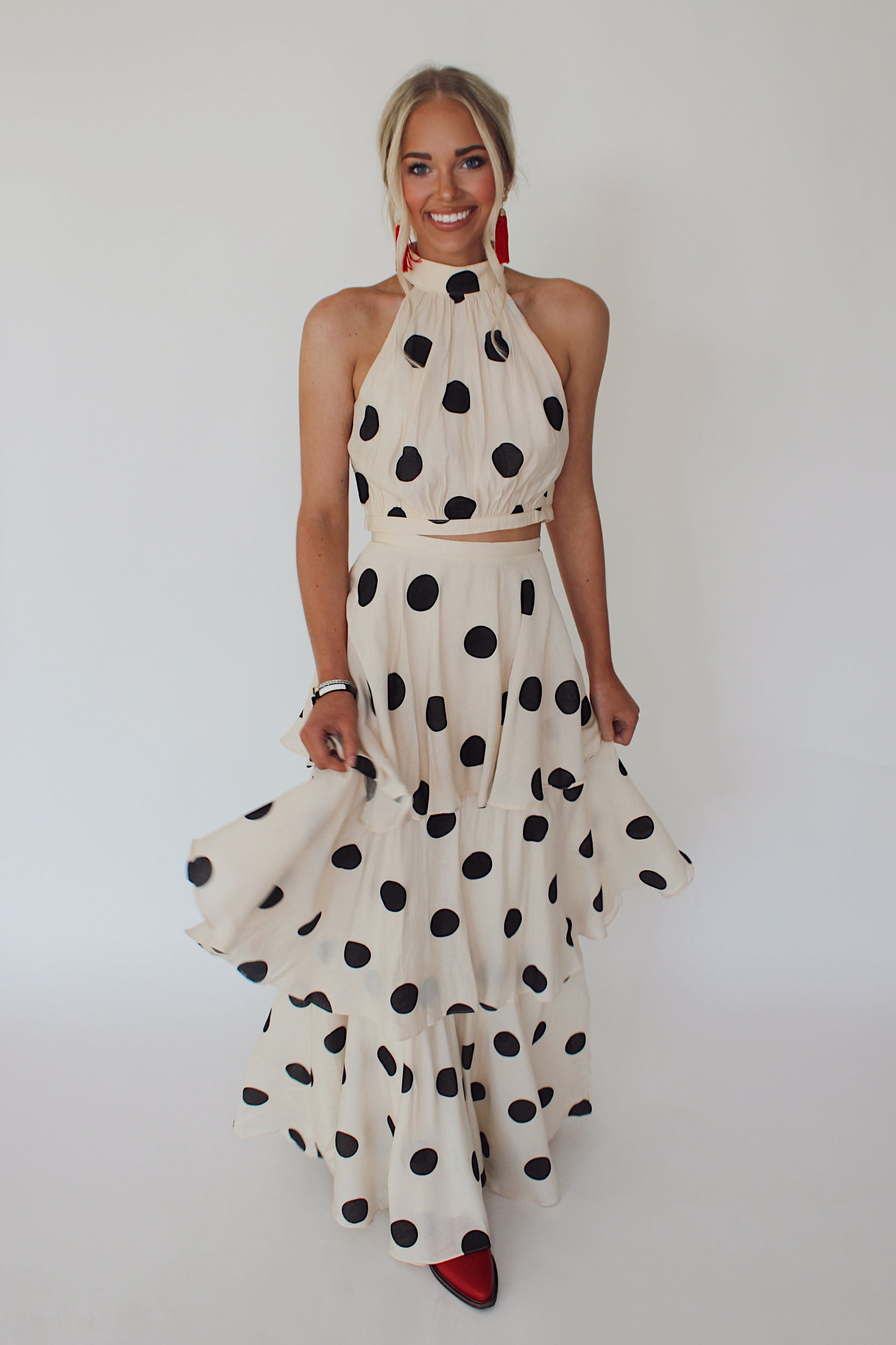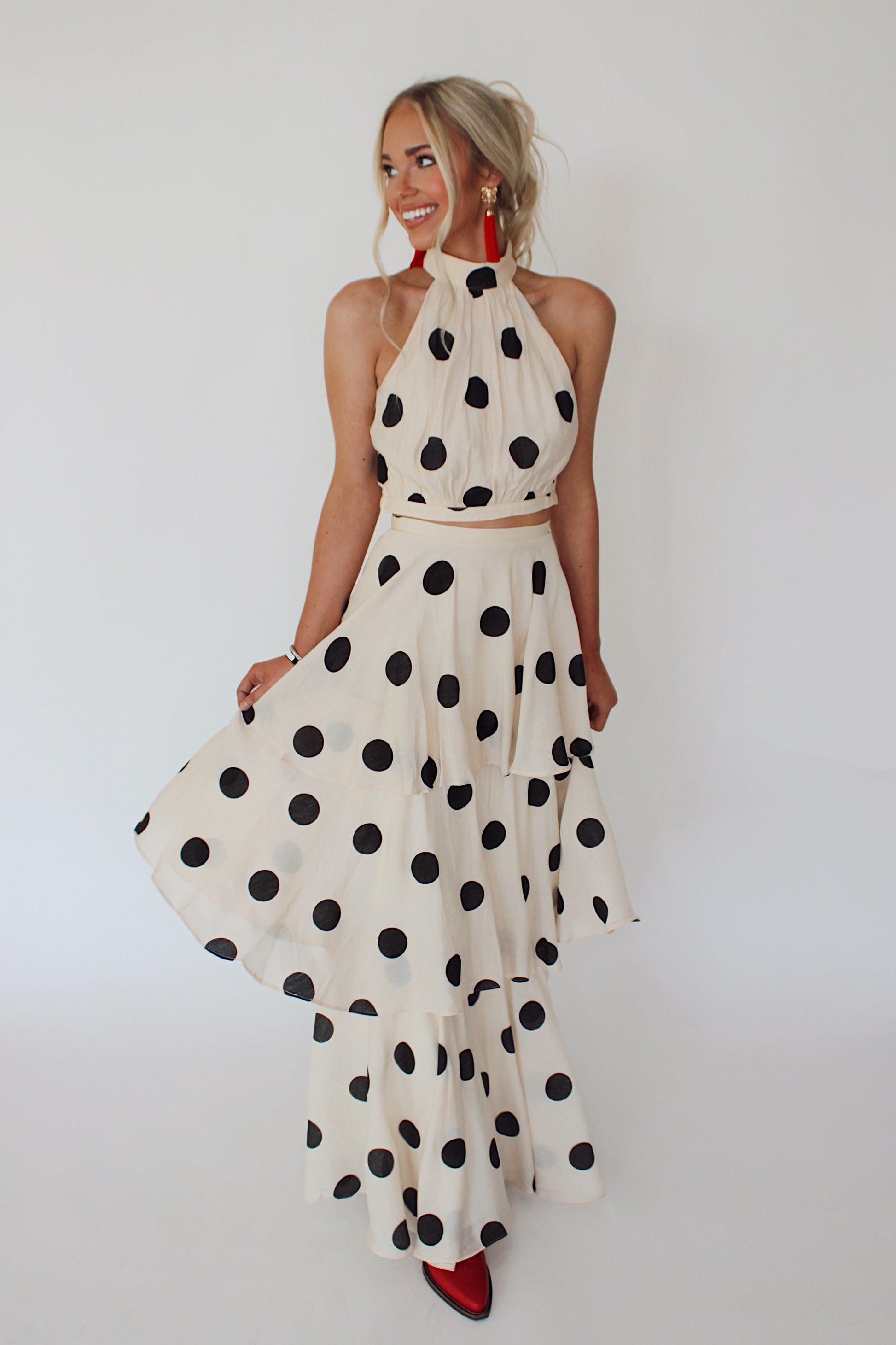 Turn heads with this playful Polka Dot Skirt Set featuring a flowing cream maxi skirt dotted with classic black polka dots, paired with a chic halter neck top. Perfect for sunny days or lively evenings, it combines comfort and style with a fun, vintage flair that lets you dance and twirl freely. Effortlessly feminine and spirited, this set adds a joyful twist to your wardrobe.