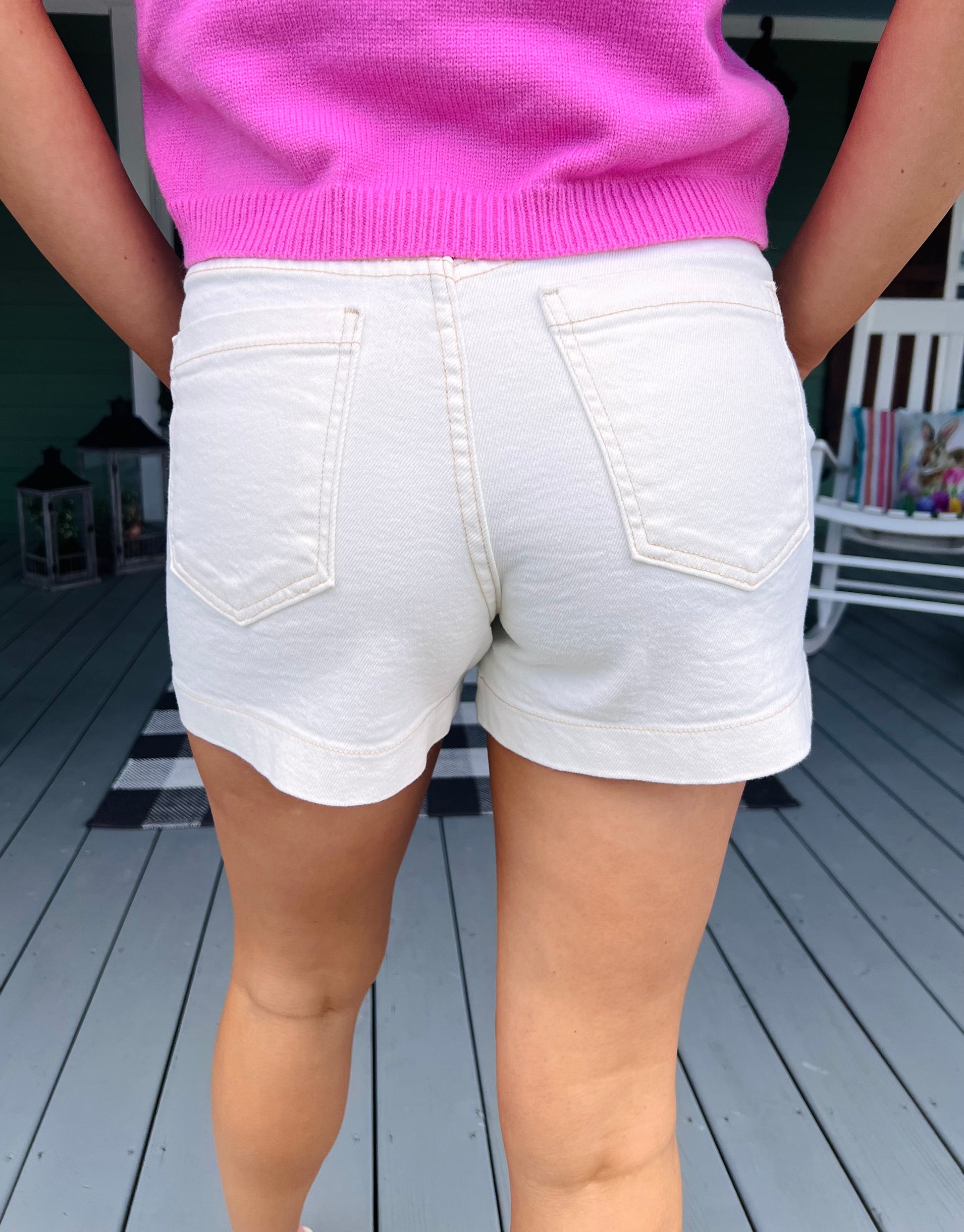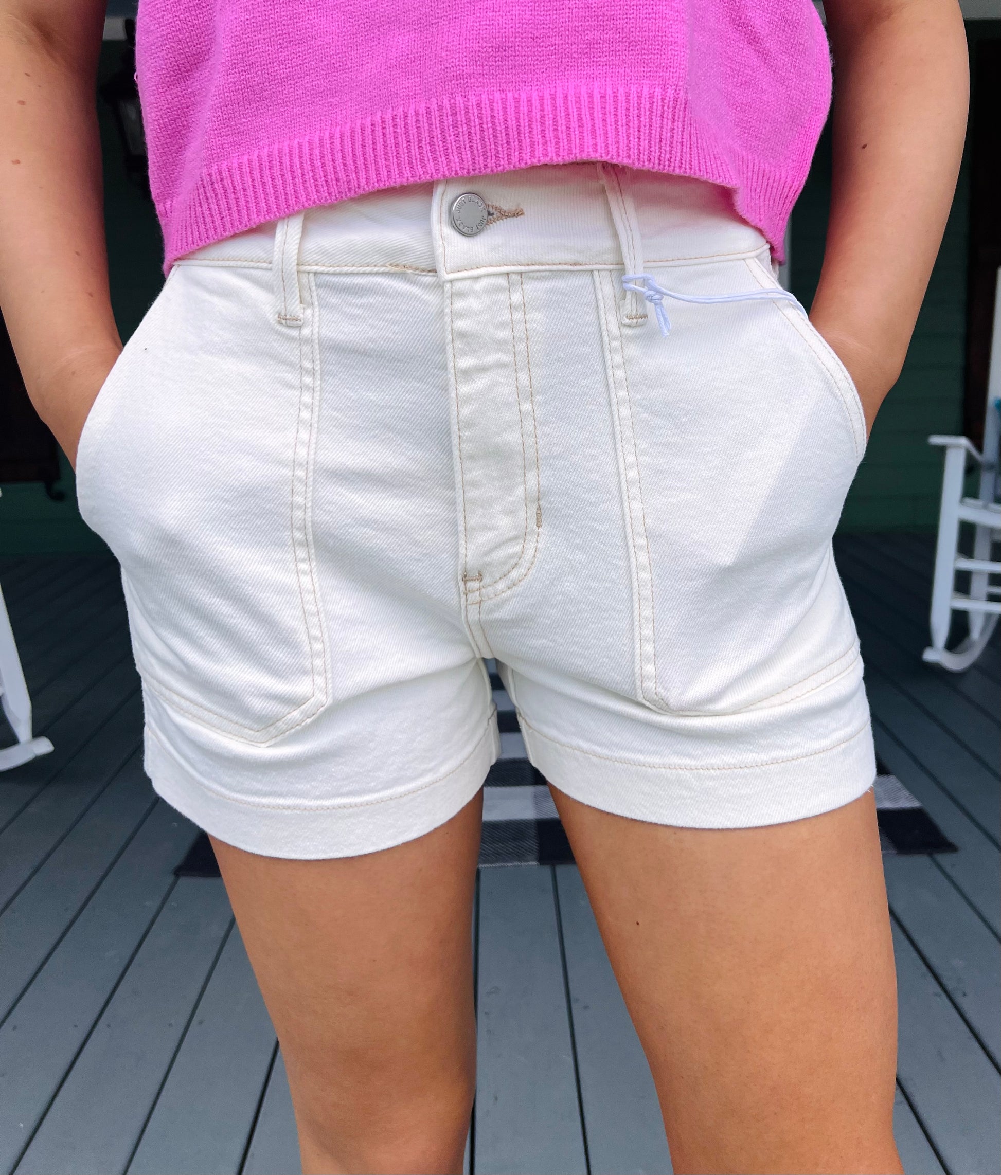 Rock these Polly High Rise Cargo Shorts in off white for a sleek look with plenty of storage. These statement shorts are perfect for any outfit, elevating your style while providing functionality. You won't have to sacrifice fashion for convenience with this must-have piece.