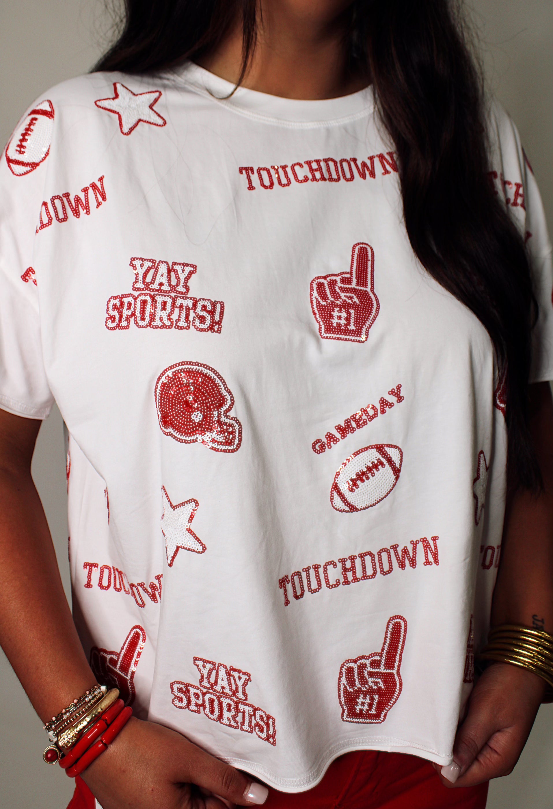 Get game day ready with the Stewart Simmons Sequin Football Tee in Red! Perfect for cheering on the Appling Pirates or the Dawgs, this sparkling tee adds fun and flair to your fan gear. Show your team spirit with a playful touch that shines bright in the stands.