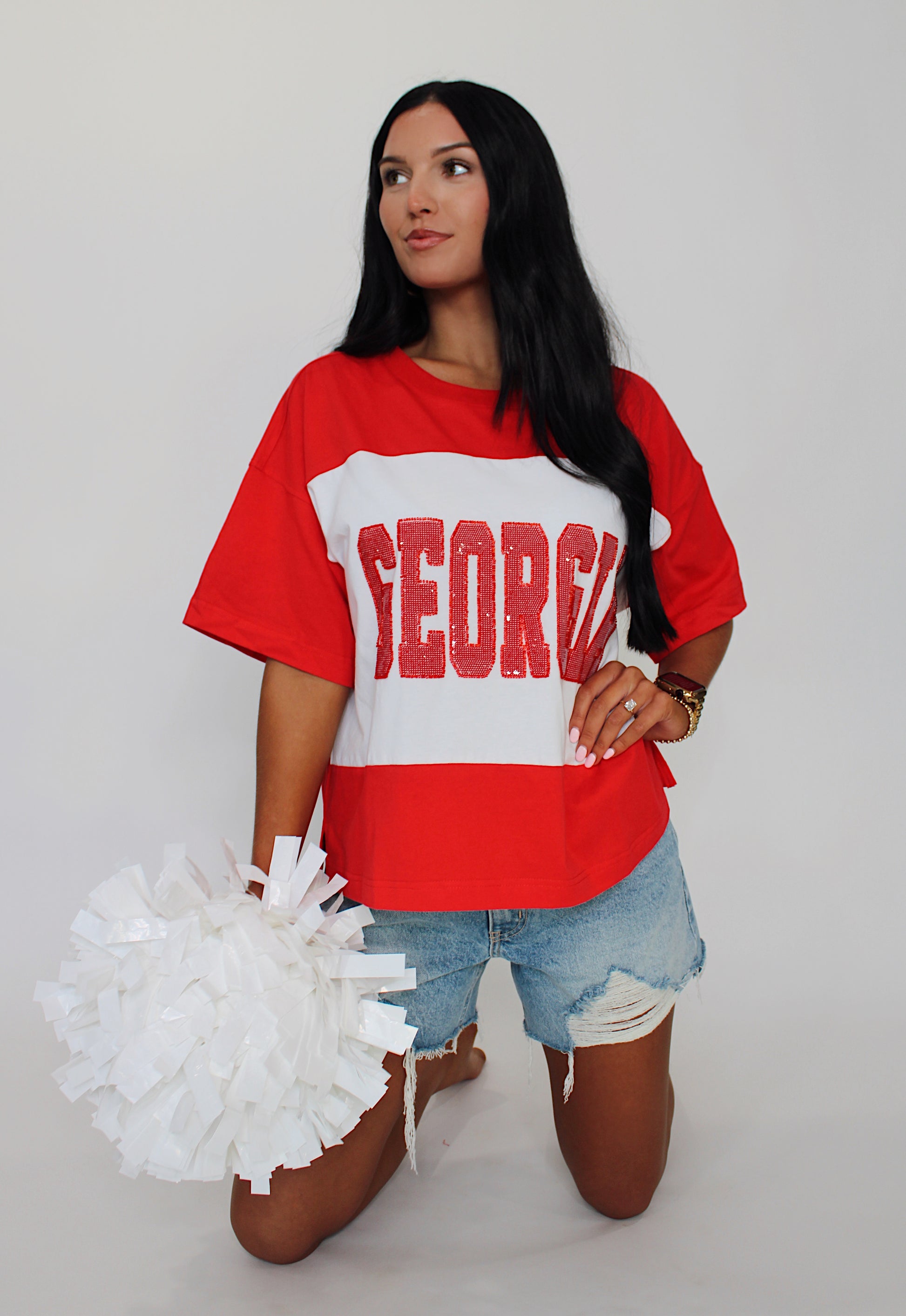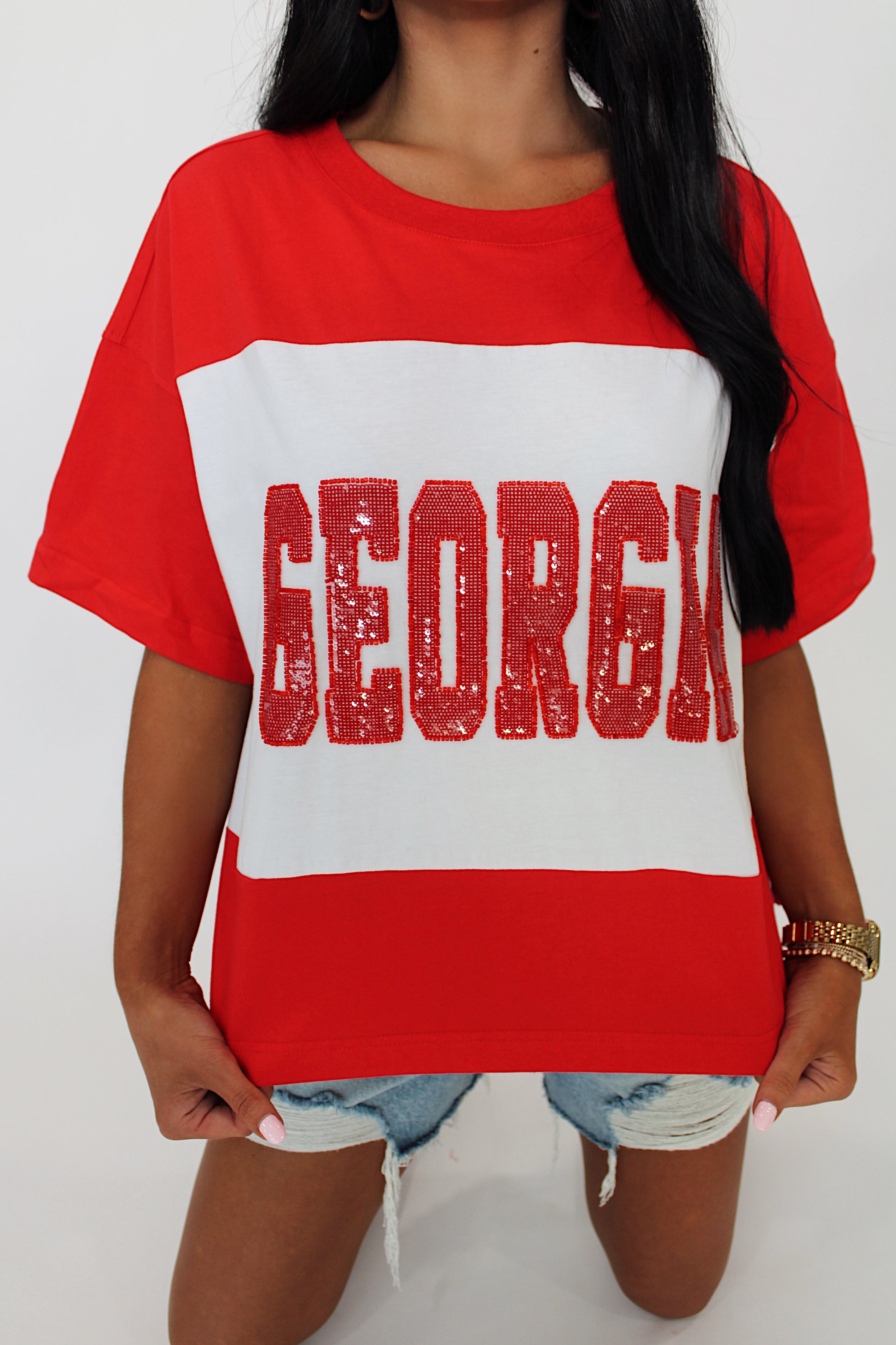 Show your team spirit in style with the Stewart Simmons Colorblock Sequin Tee. Perfect for game day, this playful tee sparkles with vibrant sequins that catch every eye. Cheer on your Dawgs while staying comfortable and trendy—because winning looks good on you!