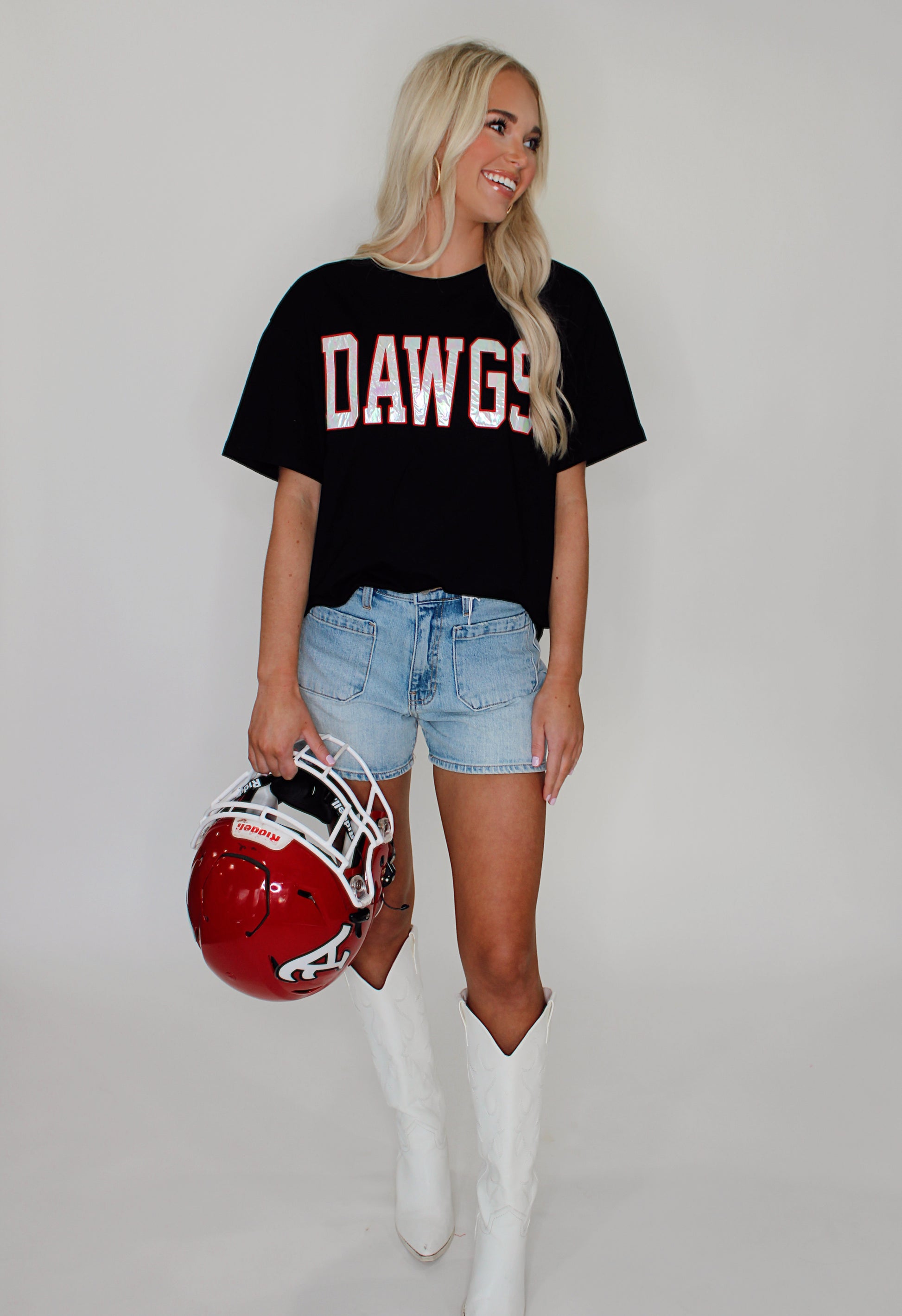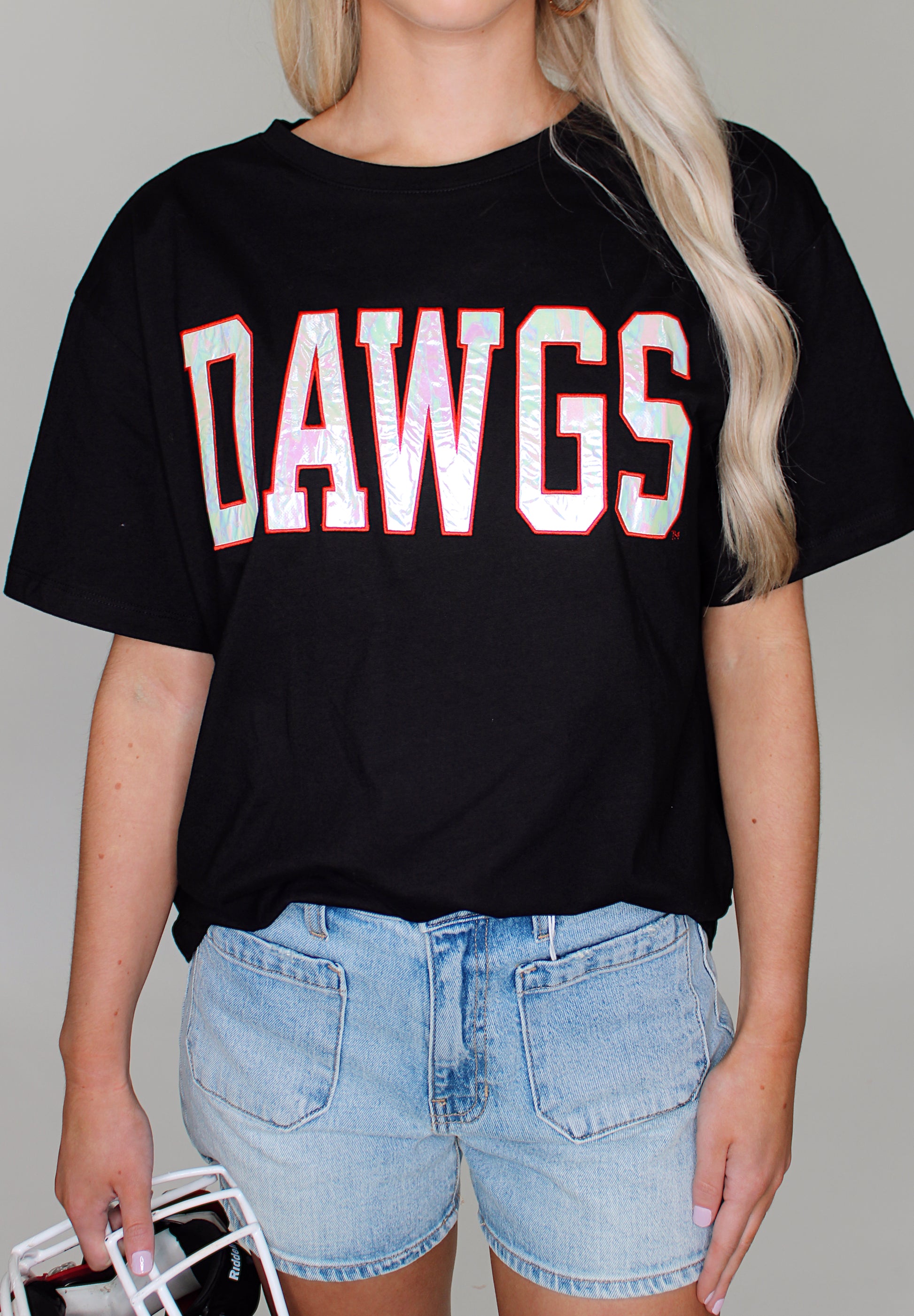Show your team spirit in style with the Stewart Simmons - The Varsity Boyfriend Tee. Crafted from shimmering iridescent material, this playful game day tee catches the light and attention wherever you go. Featuring bold DAWGS lettering, it’s perfect for cheering on your favorite team with a fun, fashionable twist. Comfortable and eye-catching, it’s your new go-to for every game day celebration.