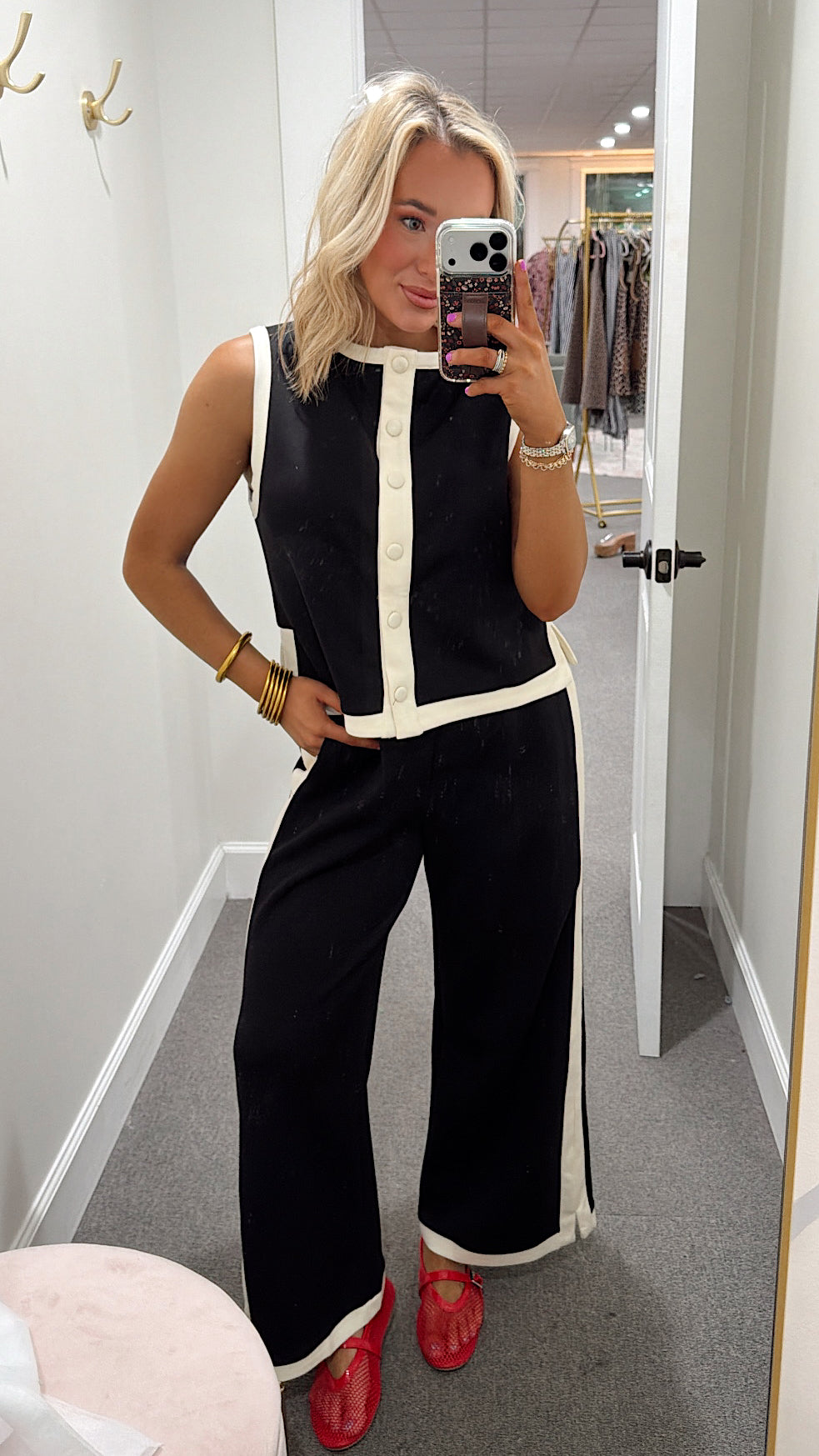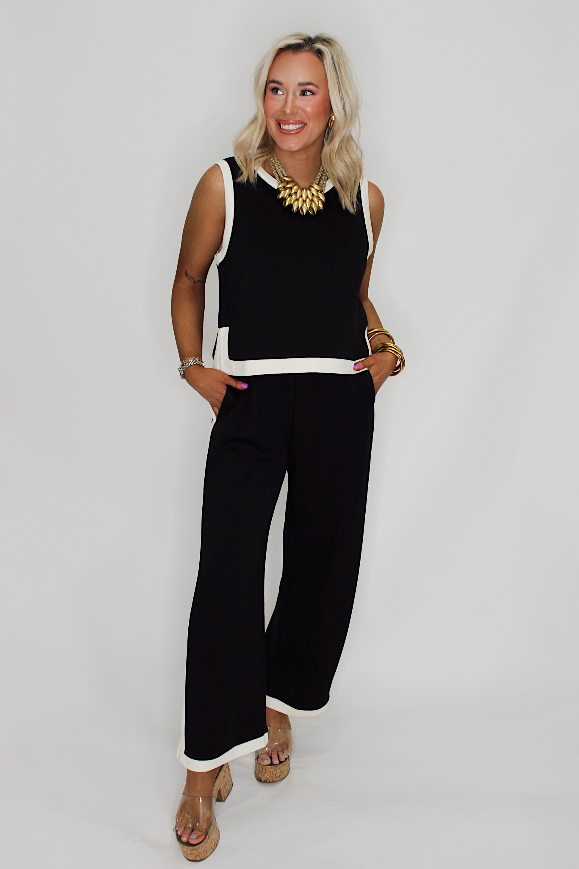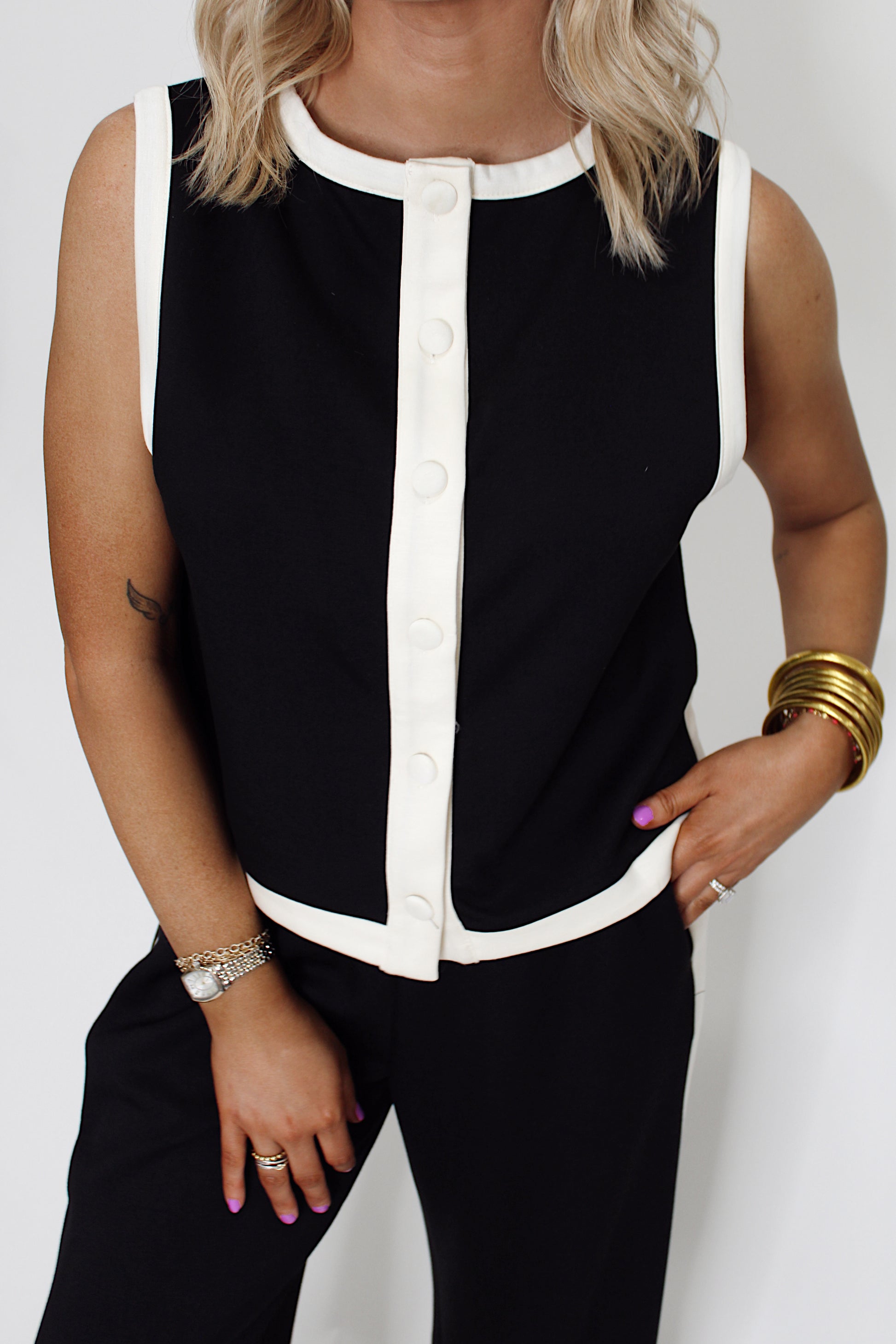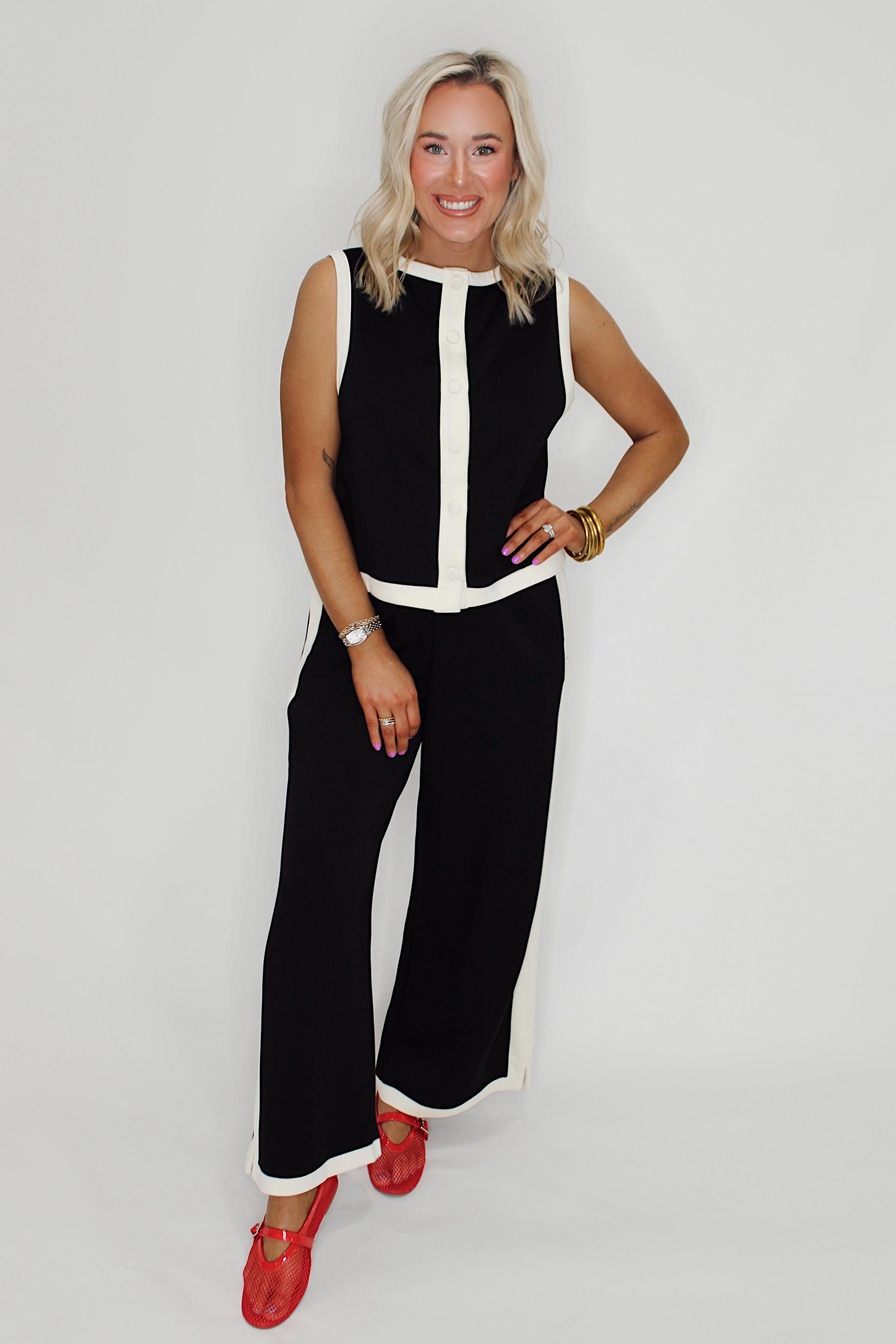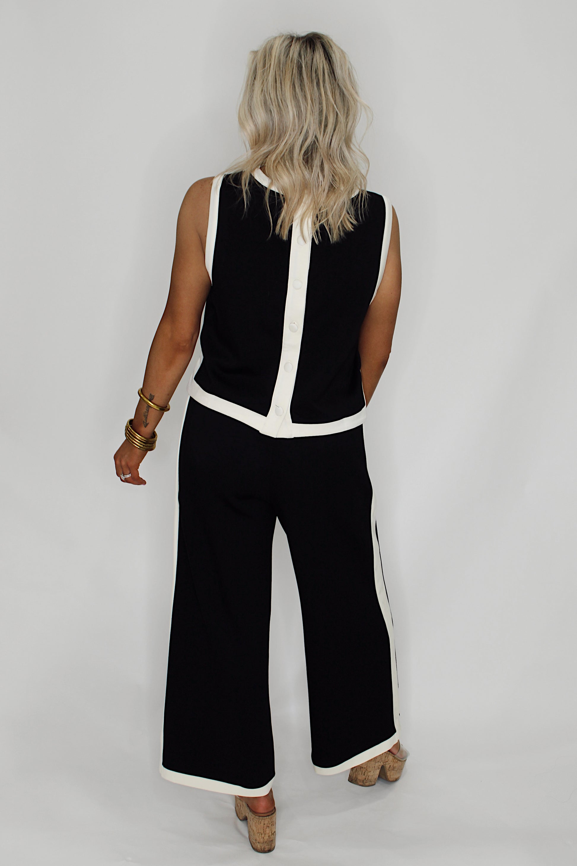 The Double Play Set brings effortless style to your everyday rotation. This sleek black ensemble features a crisp white line detail that pops, while the tank's button-back design adds just the right amount of personality. Crafted for maximum comfort, you'll find yourself reaching for this set again and again—because looking good shouldn't feel like work.