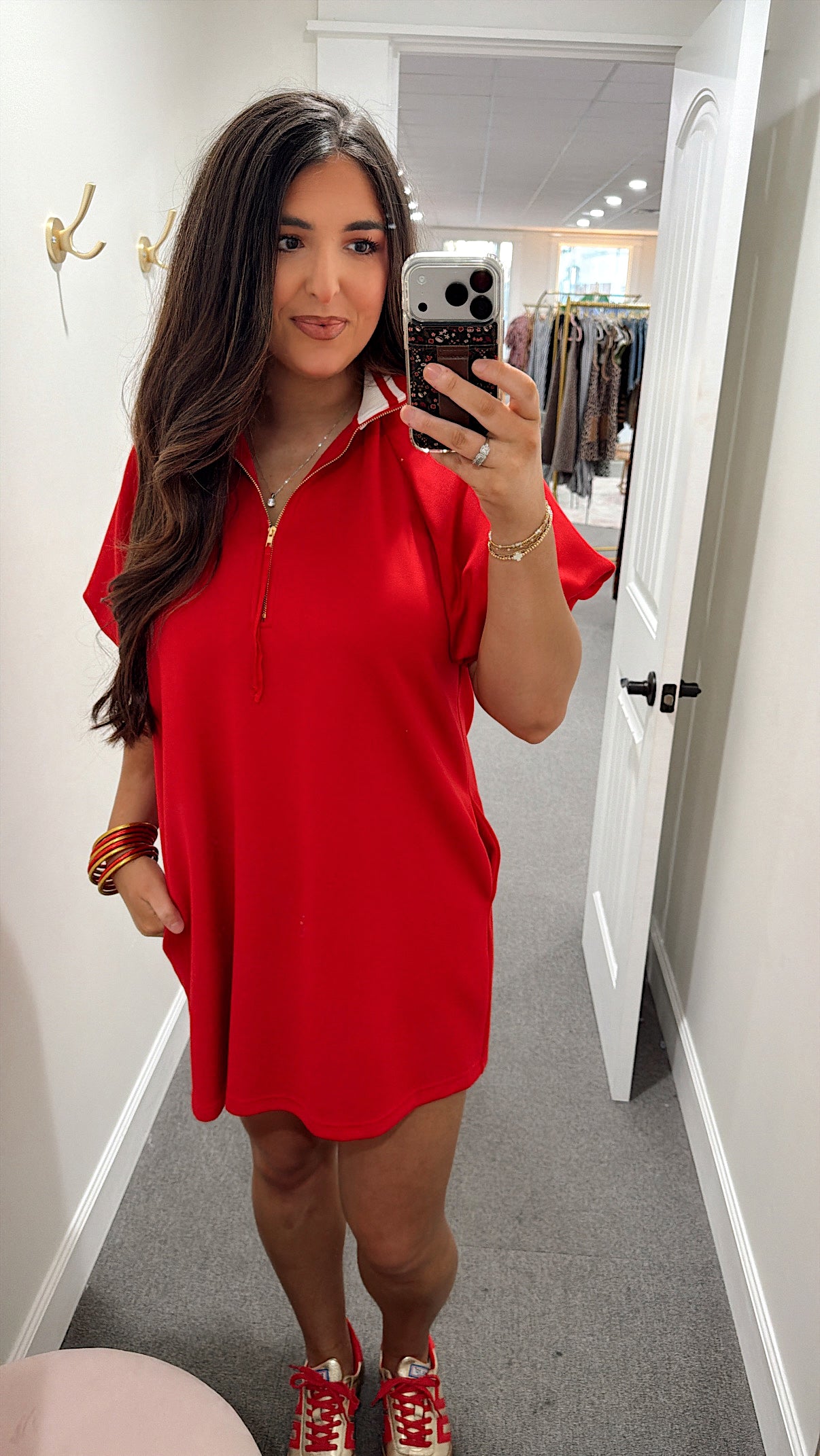 Stripes never go out of style, and this red mini dress proves it. The flattering V-neckline draws the eye upward while the soft, stretchy fabric moves with you all day long. Whether you're heading to brunch or a night out, this versatile piece transitions effortlessly from casual to dressed up. Simple, chic, and endlessly wearable.