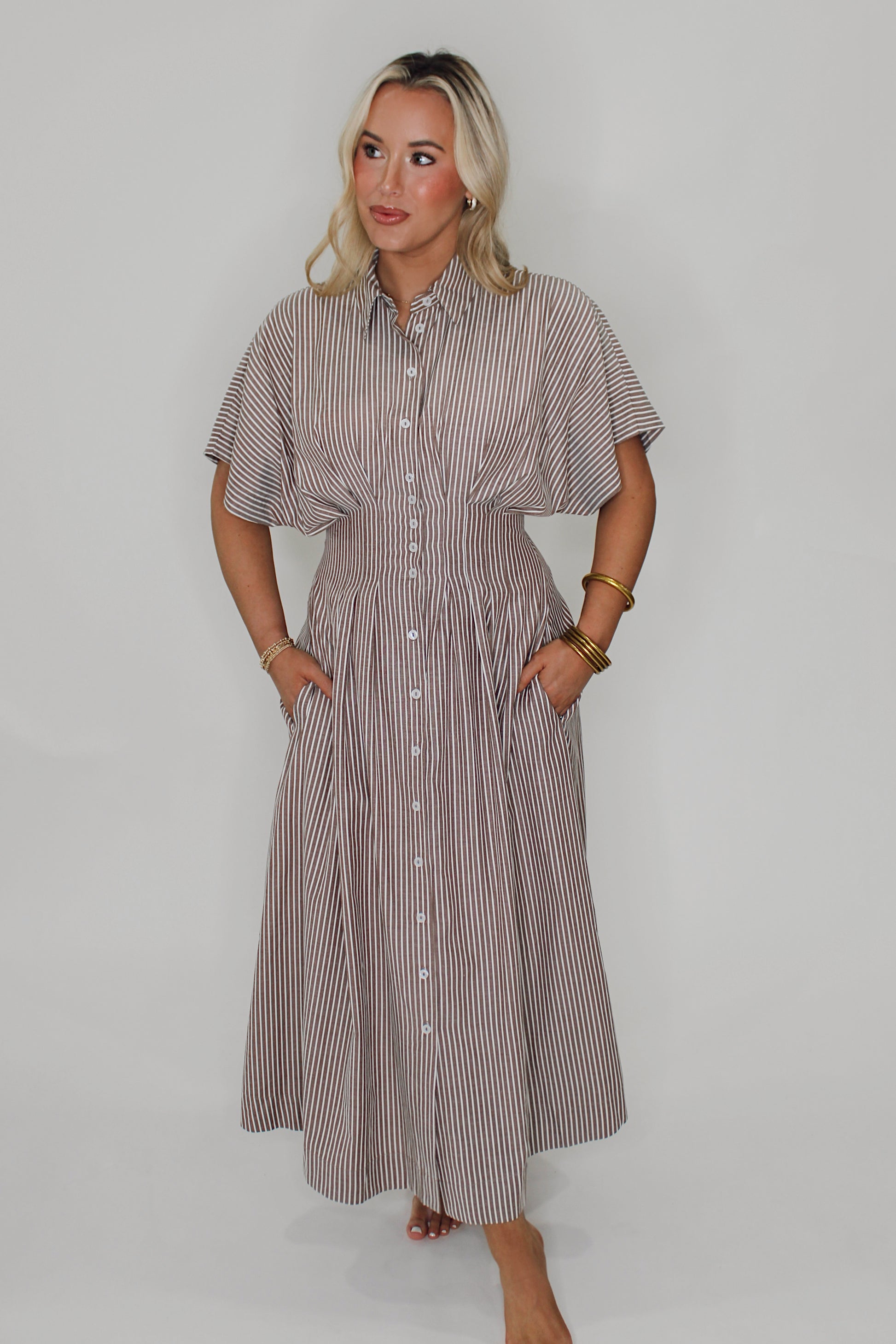 Step out in style with The Millie Striped Midi Dress, featuring charming coco and cream stripes that add a cheerful touch. Its dolman sleeves offer a relaxed, breezy fit, while the synched waist effortlessly highlights your silhouette. Perfect for twirling through sunny afternoons or casual meetups, this midi dress blends comfort and playful elegance with ease.