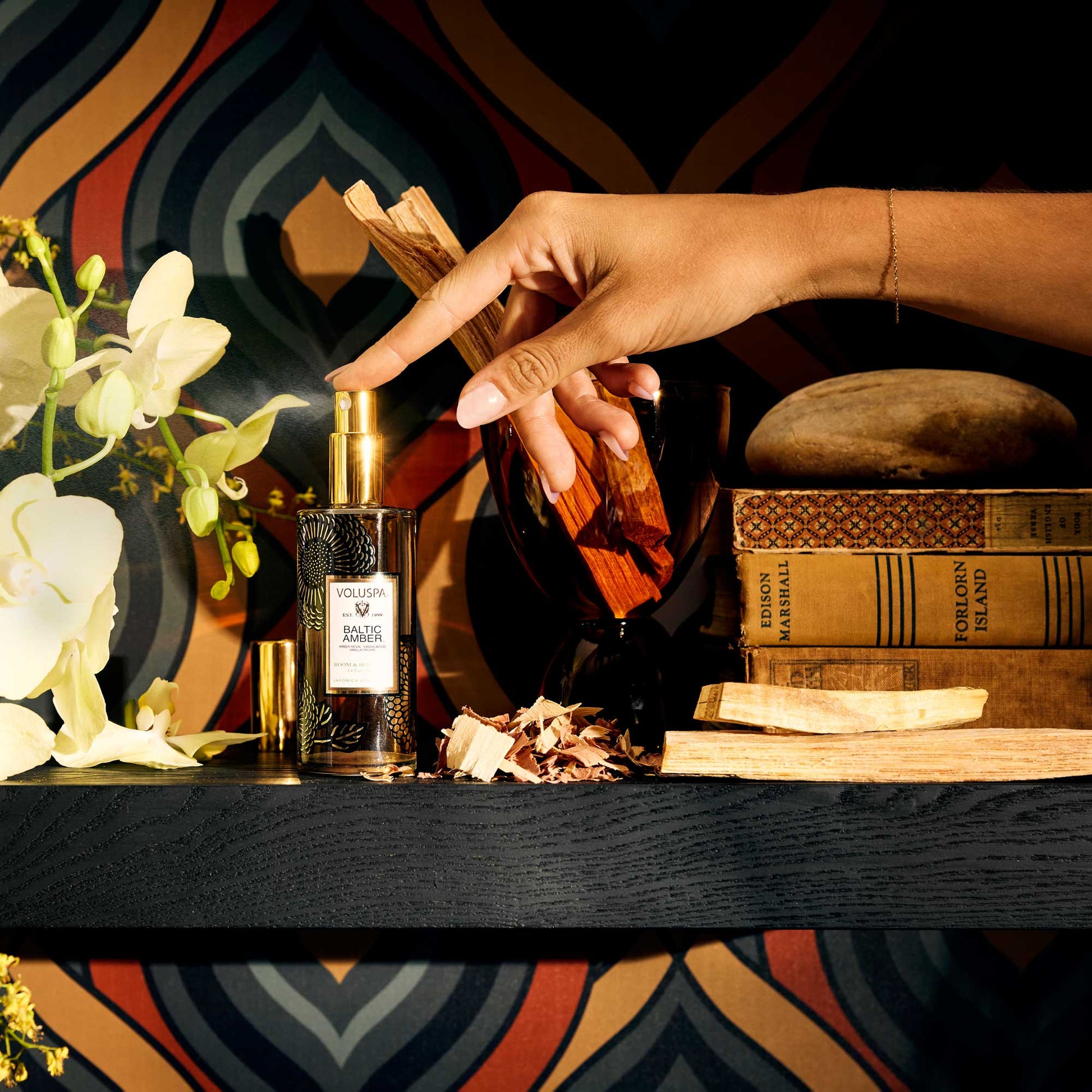 VOLUSPA fragrant room spray is hand-poured into an embossed glass vessel for a subtle pop. The lustrous glass container is filled with a fragrance you can mist wherever you want it most in your home.